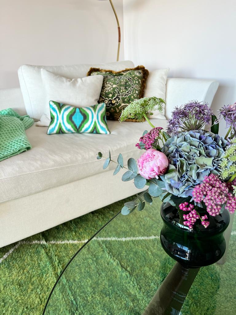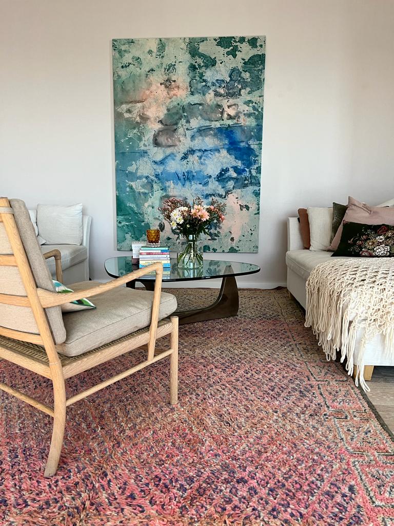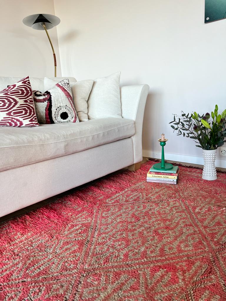I vår Beni Ourain kategori finner du en rekke ulike tepper. Her har vi stylet med et Taznakht teppe i klassisk mønster. Fargen gjør hele innredningen.