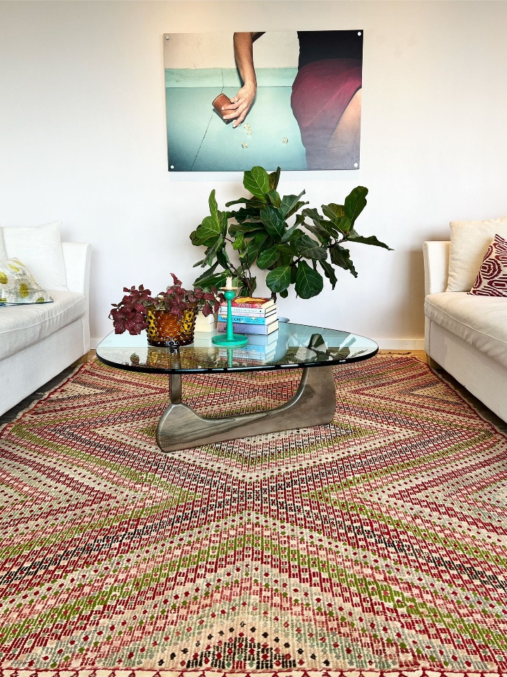 Her har vi innredet med en 40 år gammel kelim fra Tyrkia. Disse teppene er flatvevde og gir et ryddig inntrykk til tross for mye mønster og farge.