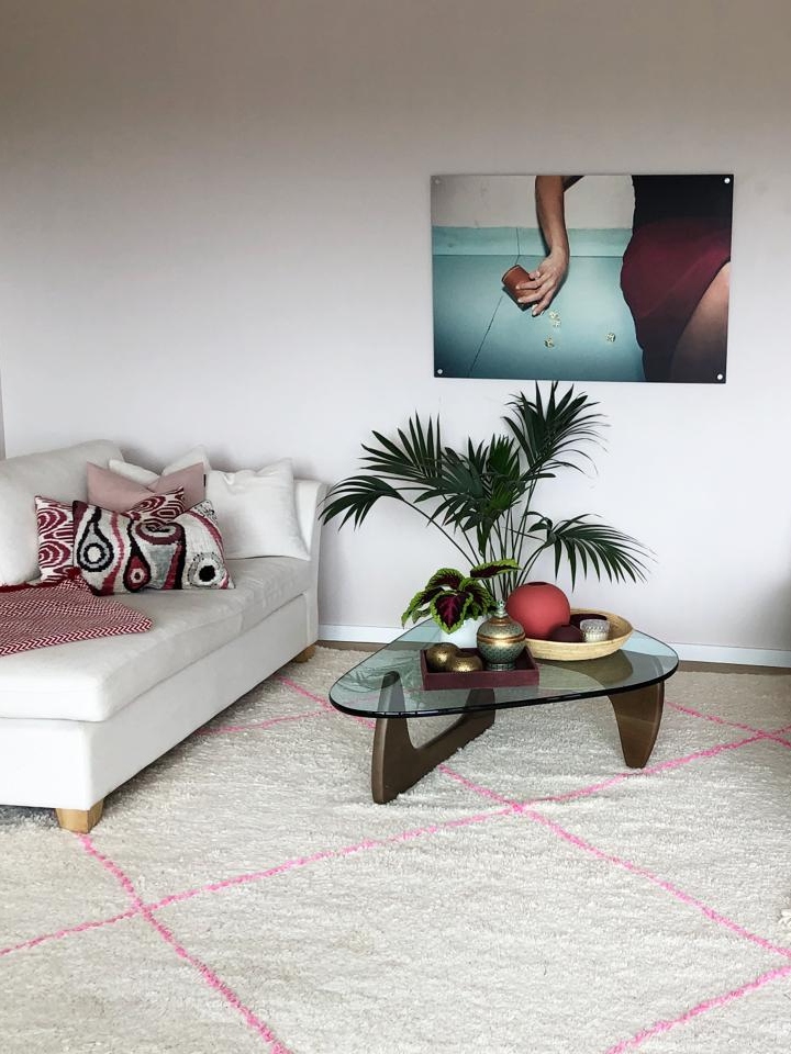 Her har vi gått for et kult og varmt 80-talls teppe. Tyggisrosa vintage gir karakter og sjarm til interiøret, samtidig som det markerer en sone i rommet.