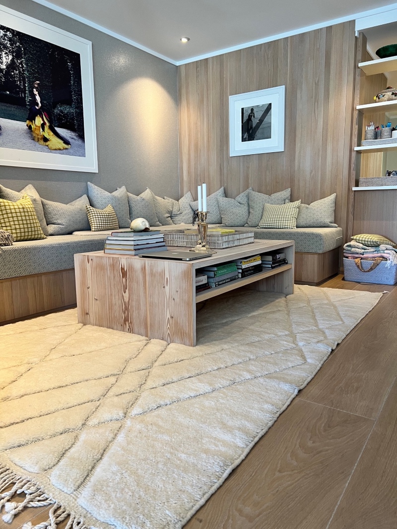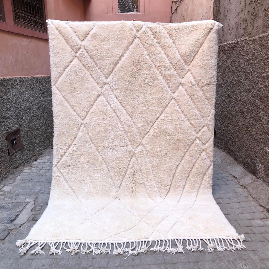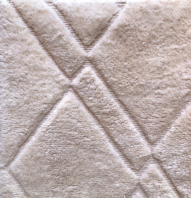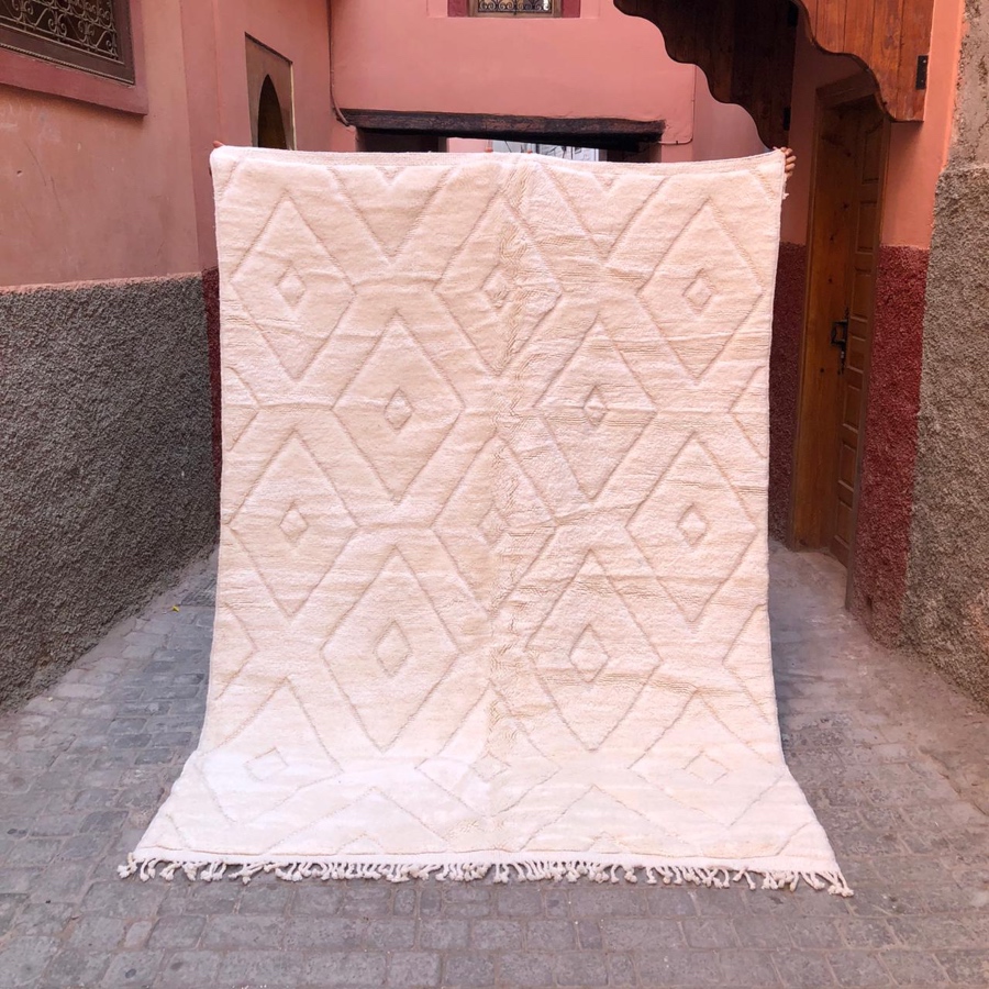 Beni Mrirt teppe 260 x 175 cm. M´rirt er en eksklusiv utgave av Beni Ourain . Teppet er mye tykkere og tyngre, mens mønsteret er dypere inn i teppet. Tettere knyttet med andre ord.100% ull, knyttet for hånd. Nydelig, luksuriøst og mykere enn det mykeste. En investering for livet!