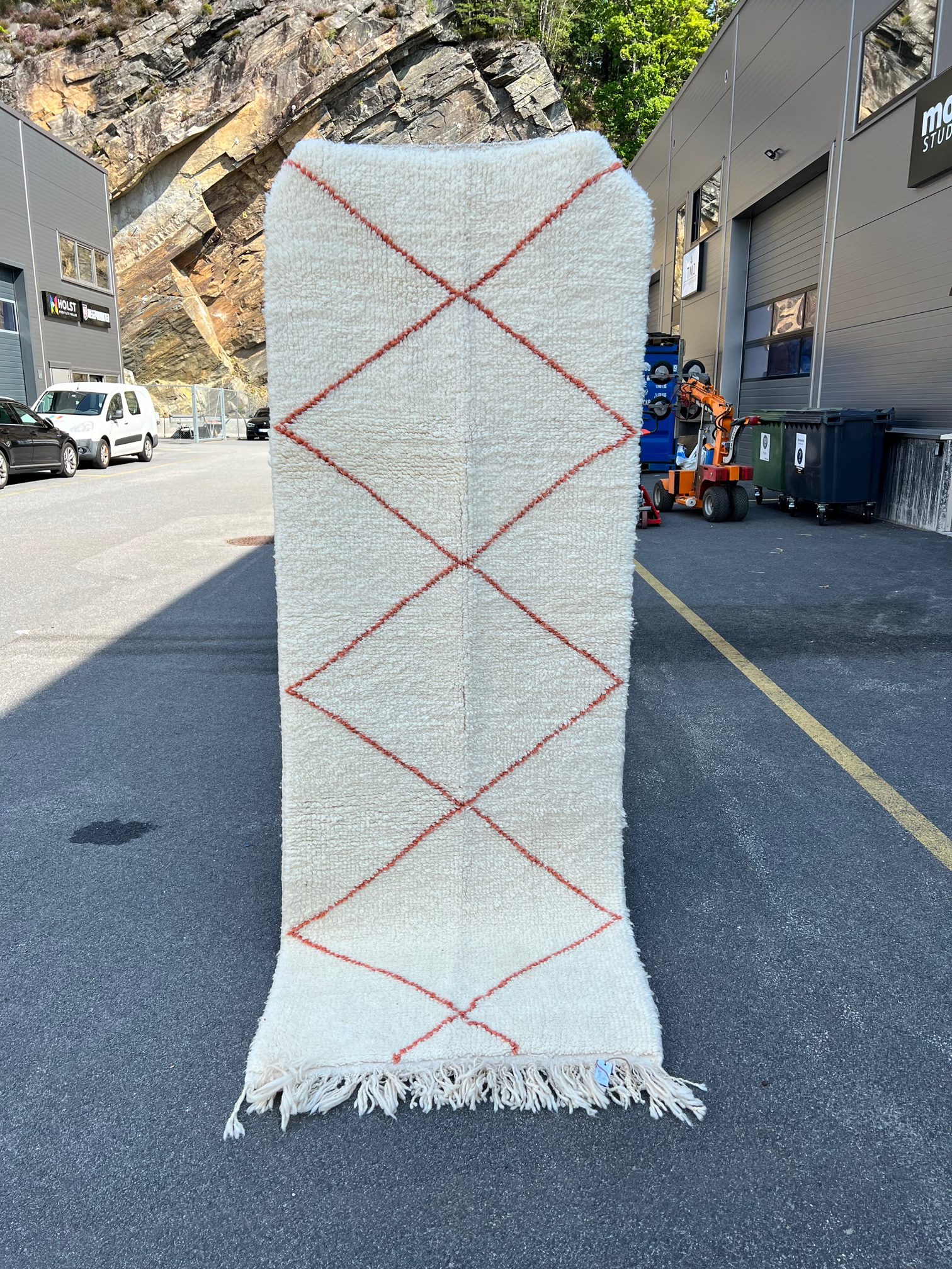 Fantastisk Beni Ourain løper. Klassisk design, tykt og mykt. Knyttet for hånd som alle våre marokkanske tepper. Nydelig i de fleste interiører. Glamorøst, klassisk og tidløst. One of a kind. Dette teppet vil garantert holde deg varm på beina gjennom vinteren!