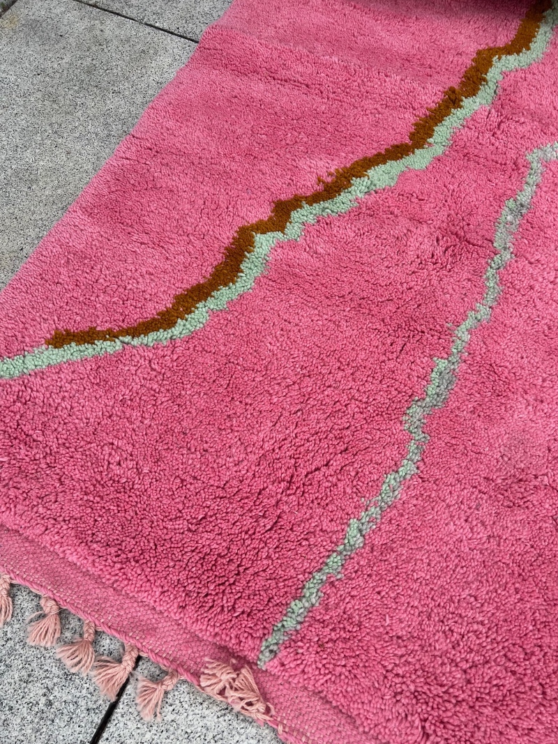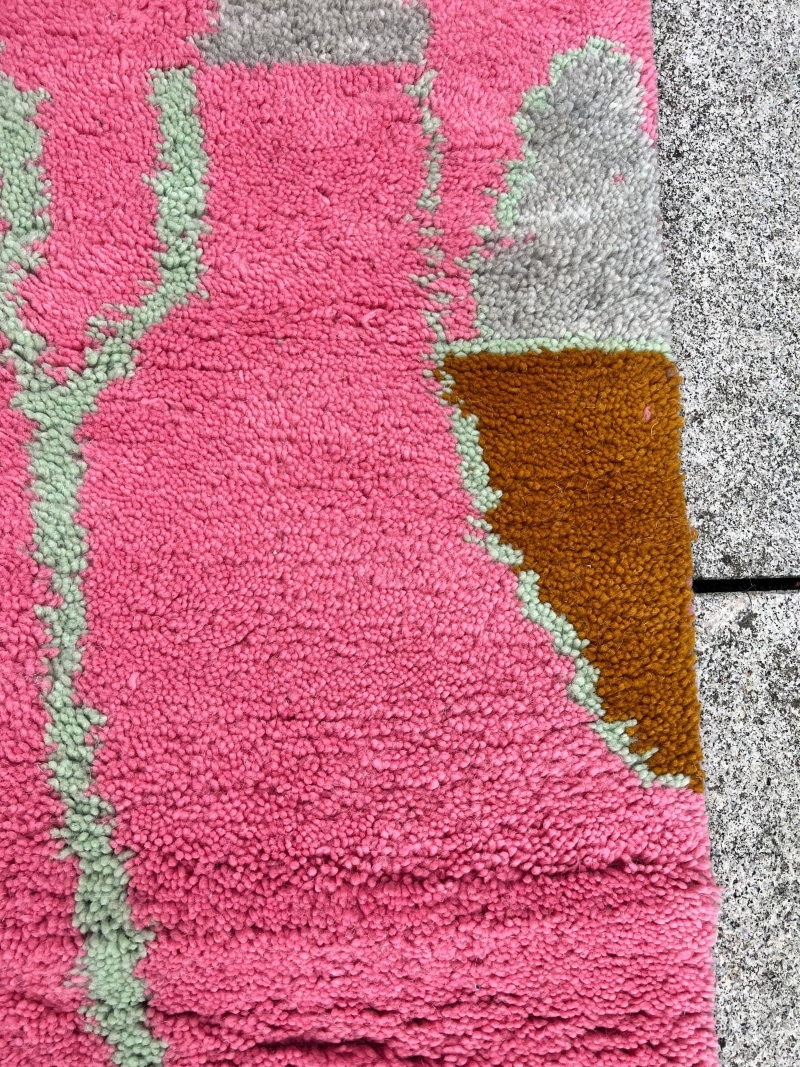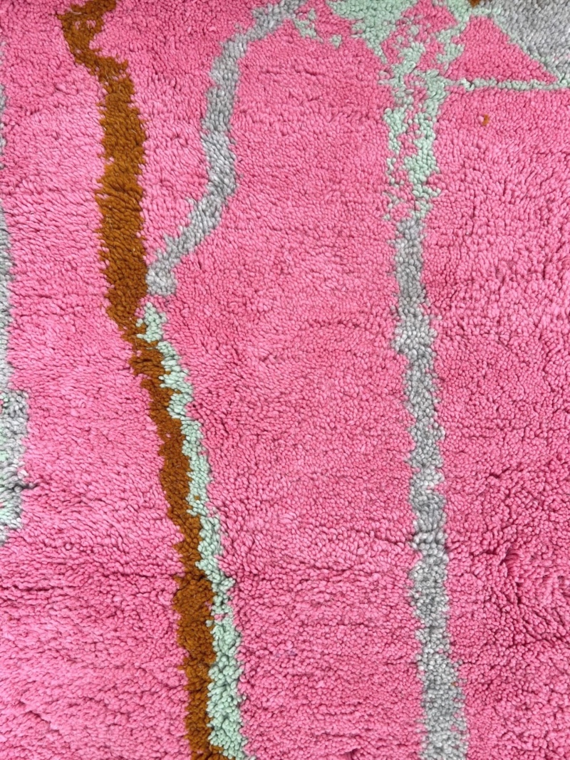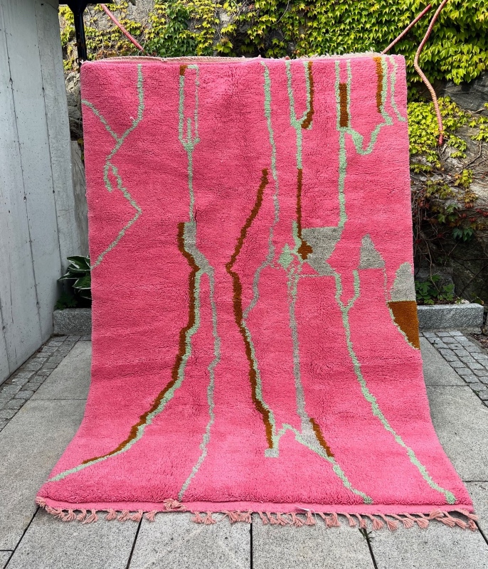 En vakker og kul variant av Beni Ourain teppe i rosa, aqua og syregrønn.. Tykt og mykt. Knyttet for hånd som alle våre marokkanske tepper. Nydelig i de fleste interiører. Glamorøst, klassisk og tidløst. One of a kind. Dette teppet vil garantert holde deg varm på beina gjennom vinteren - og ikke minst gi masse ekstra til interiøret!