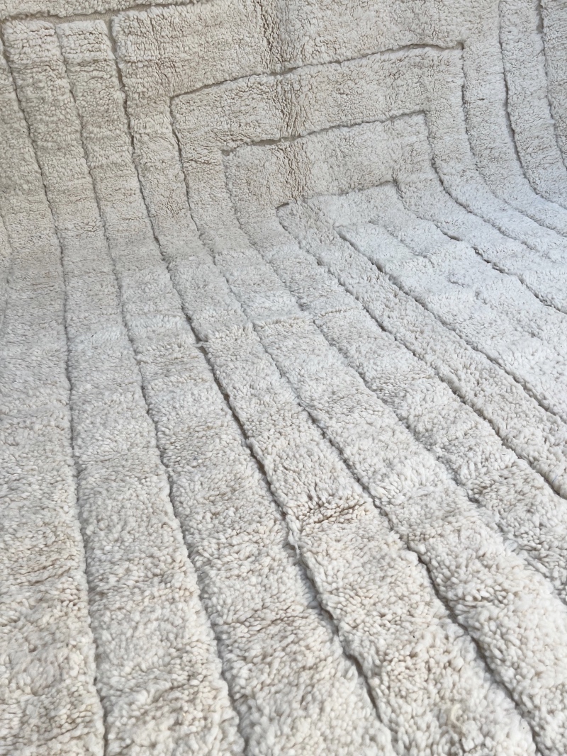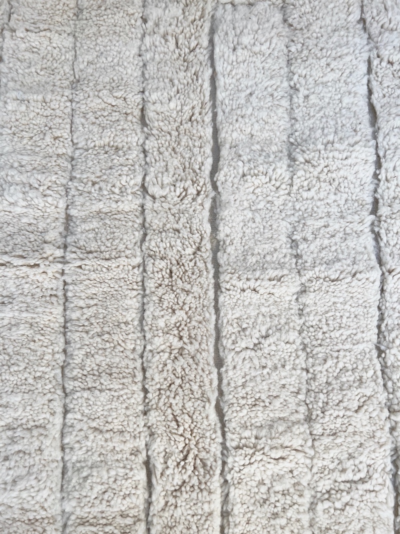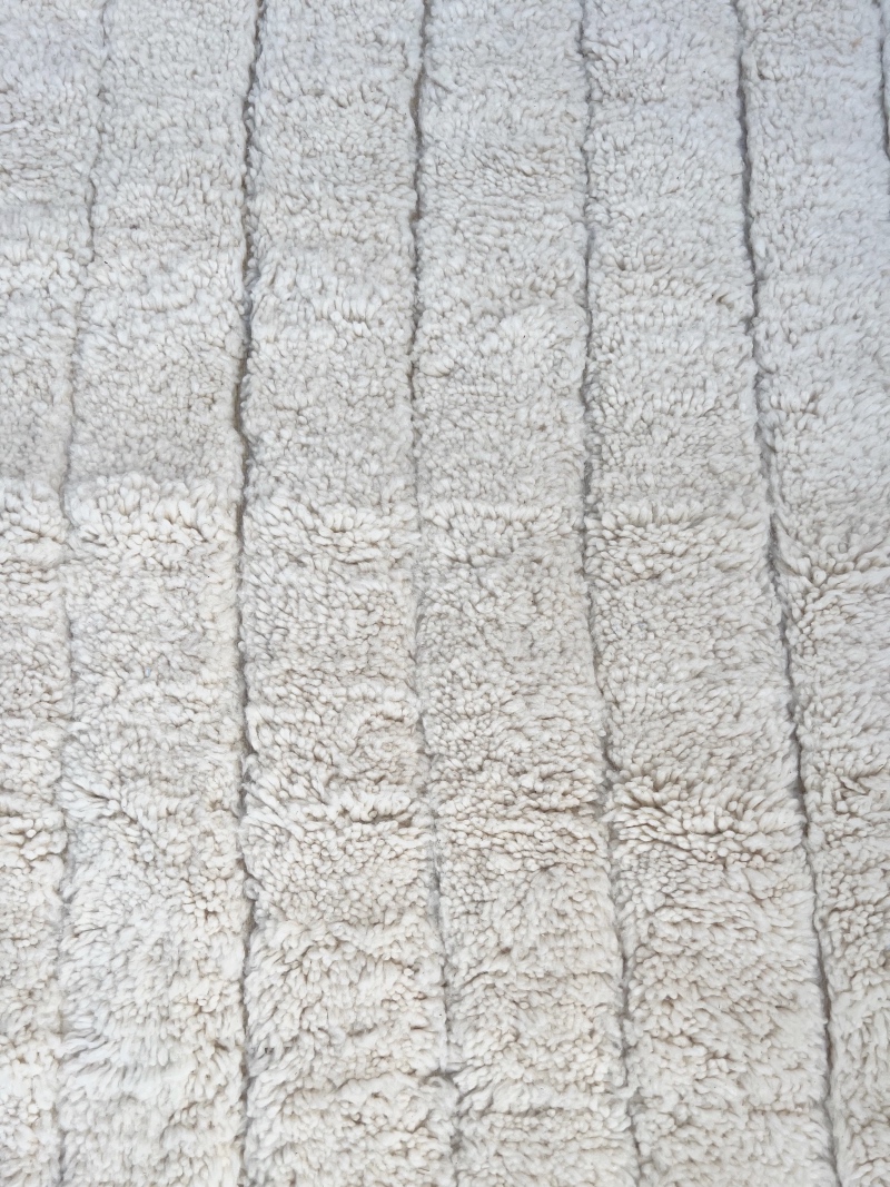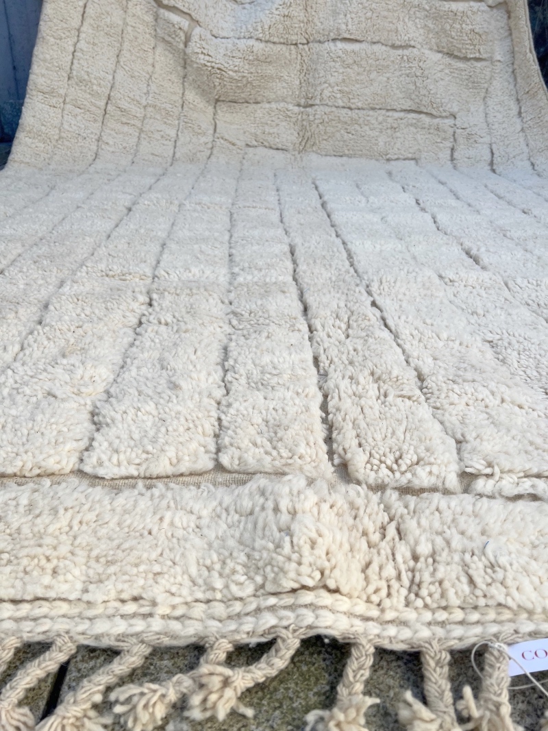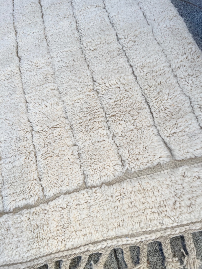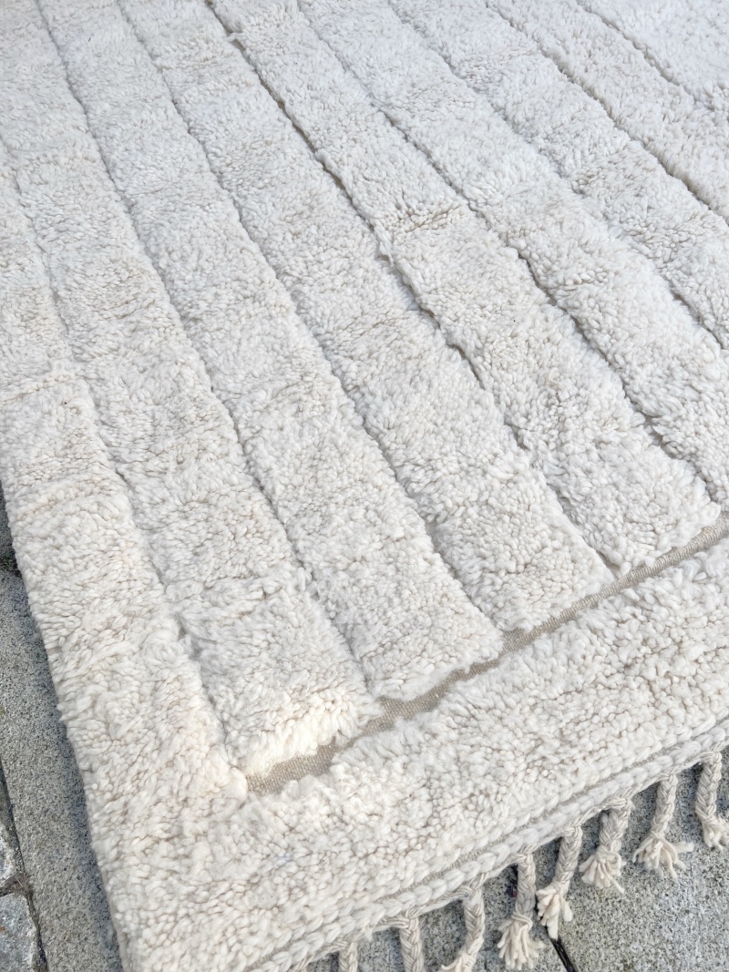 Etter berbertradisjon har teppene kun frynser på den ene siden. Hvert eneste teppe er unikt. Beni Ourain-teppene er tidløse og klassiske i sin enkelhet og passer inn i alle interiører. Det vil garantert gi hele rommet et løft.