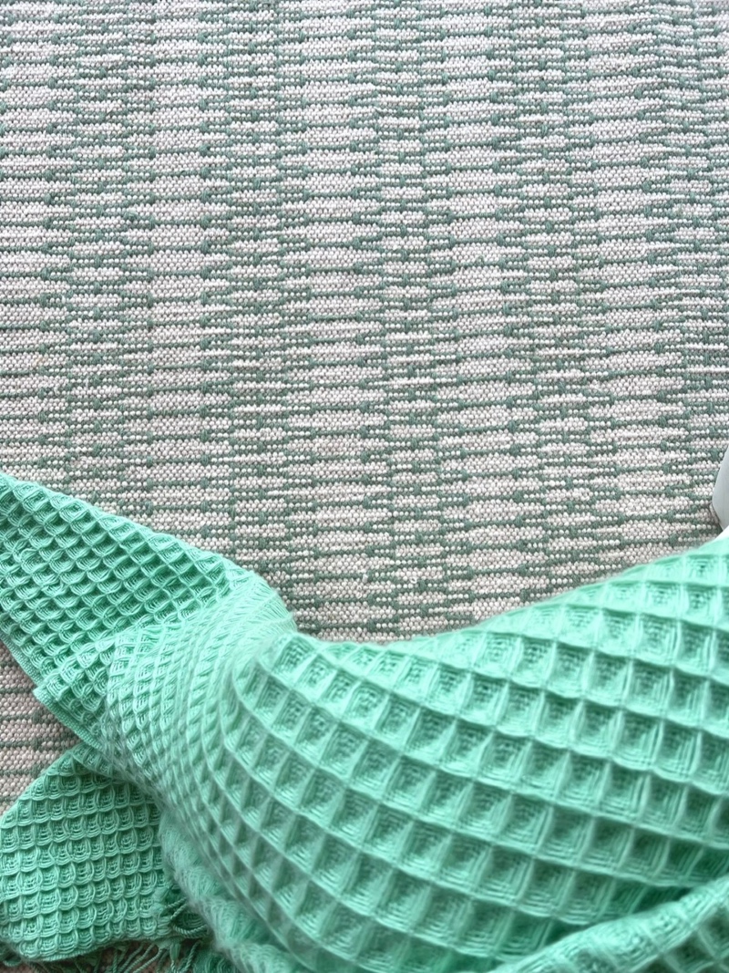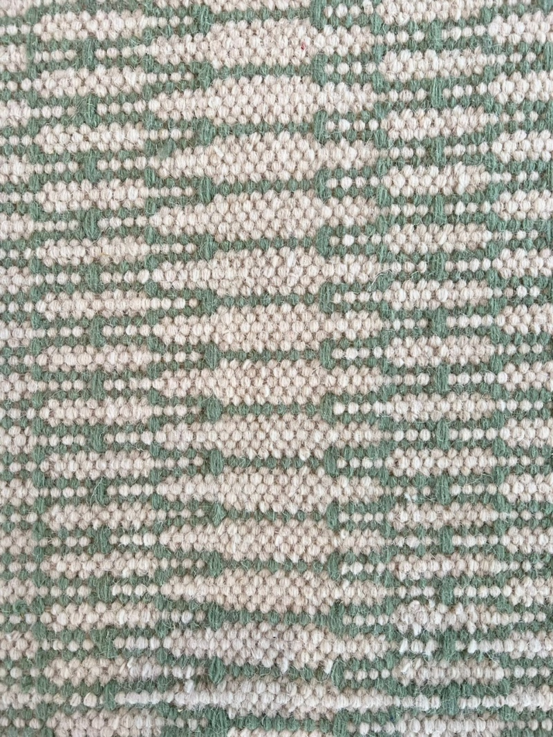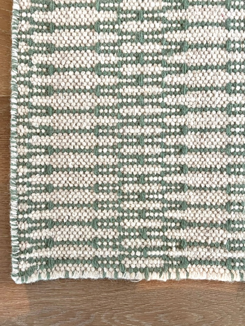 Nydelig dhurrie som er håndvevd i 100% ull. Tykk og fast. Nydelig farge, dempet grønn som salvie. Mykt og varmt underlag der du trenger det. Fin størrelse. Teppet er ryddig og vil passe inn i de fleste interiører.