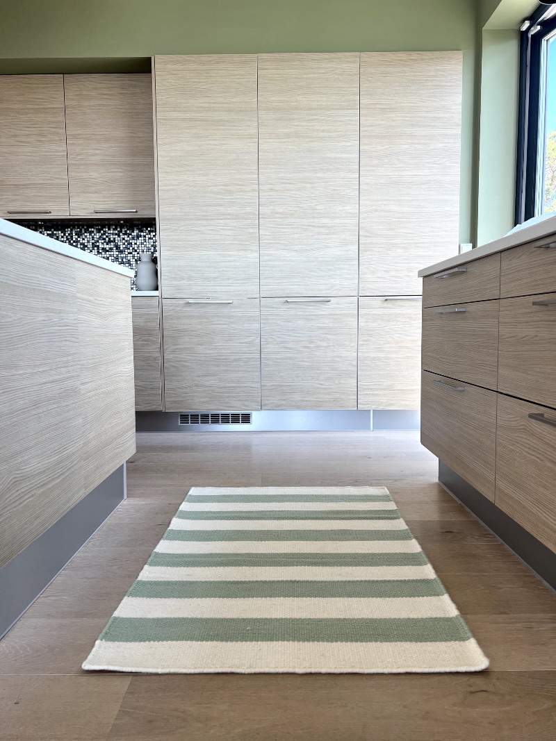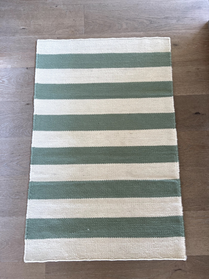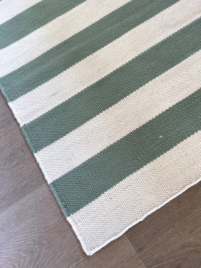 Vakre tepper vevd for hånd. Nydelig håndverk! Vi bruker New Zealand-ull i den fineste kvaliteten. Teppene er myke og slitesterke. Nydelig stripete naturhvit og sjøgrønn. Elsker disse små mattene som kan slenges hvor som helst!
