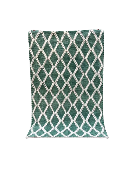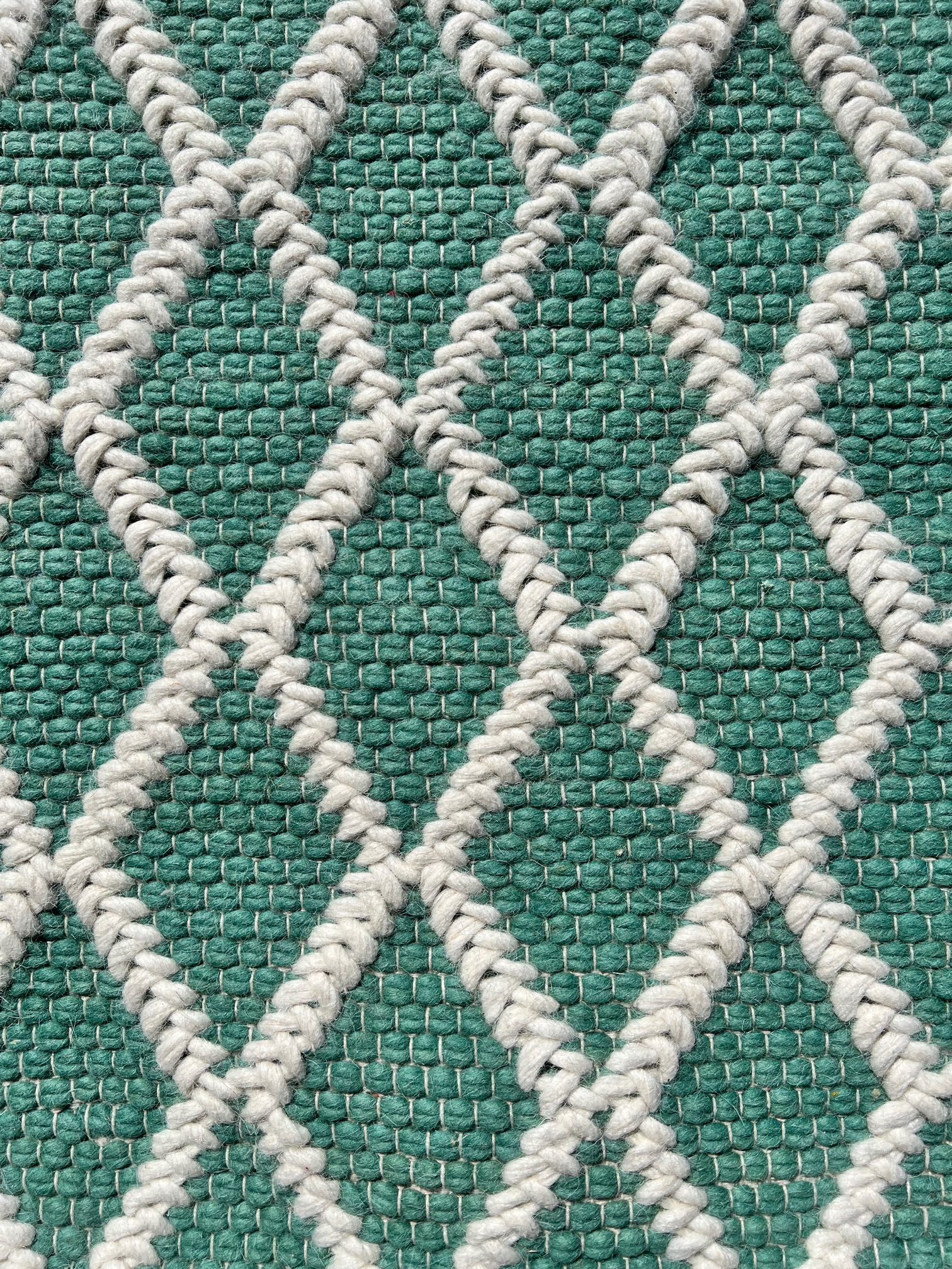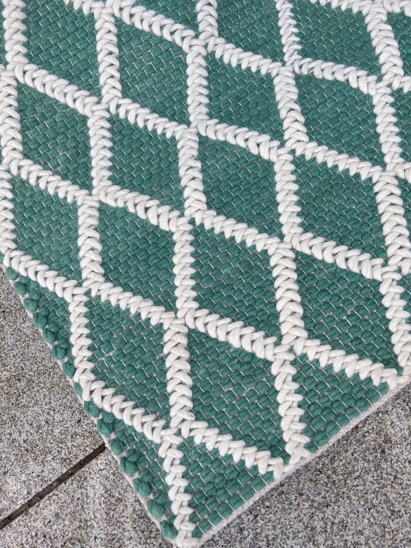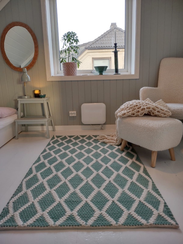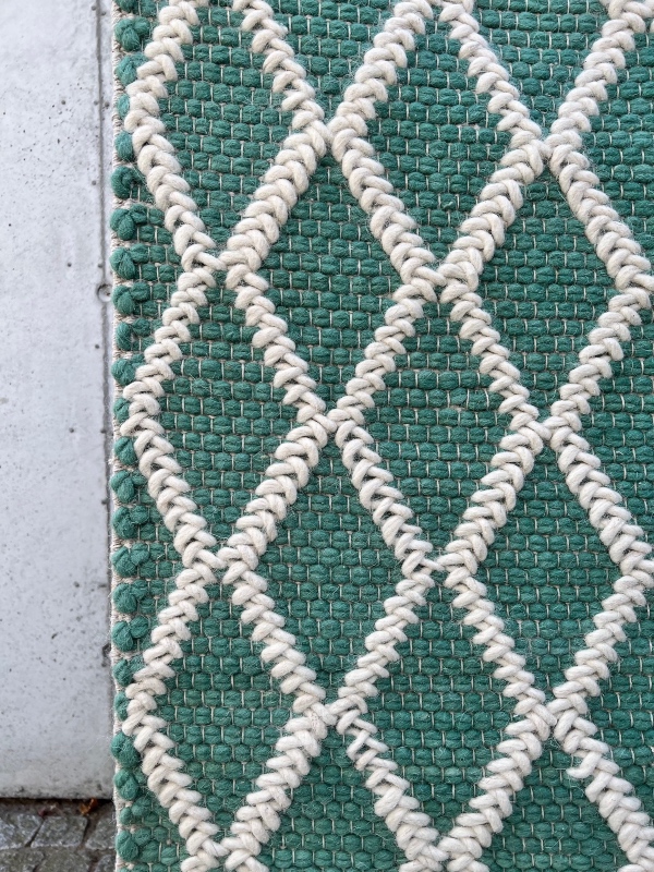 Håndknyttet ullteppe i grønt 180 x 120 cm. Dette enkle og nydelige teppet er knyttet i ull. Den er fast og tykk. Har et svært ryddig inntrykk og vil passe inn i mange ulike interiører.