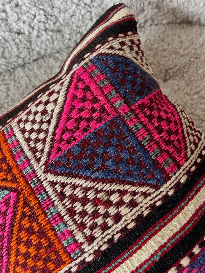 Pute i håndvevd kelim i 100% ull. Putetrekk bakside 100% bomull.