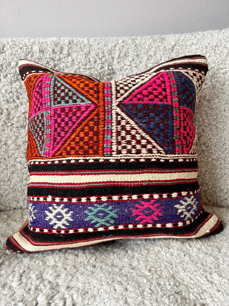 Nydelig putetrekk i friske og klare farger. Disse vakre kelimmoutene er i høy kvalitet og er pent sydd. Kan kjøpes med eller uten innmat - opp til deg! Hvert putetrekk er helt unikt, finnes kun i et eksemplar.