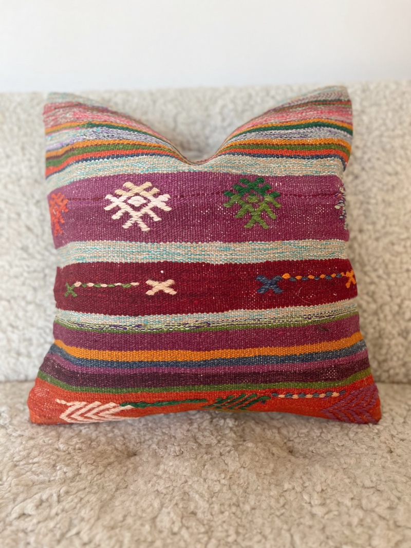 Nydelig putetrekk i nydelige og klare farger. Like fin på hytta som i sofaen hjemme. Disse vakre kelimputene er i høy kvalitet og er pent sydd. Hvert putetrekk er helt unikt, finnes kun i et eksemplar.