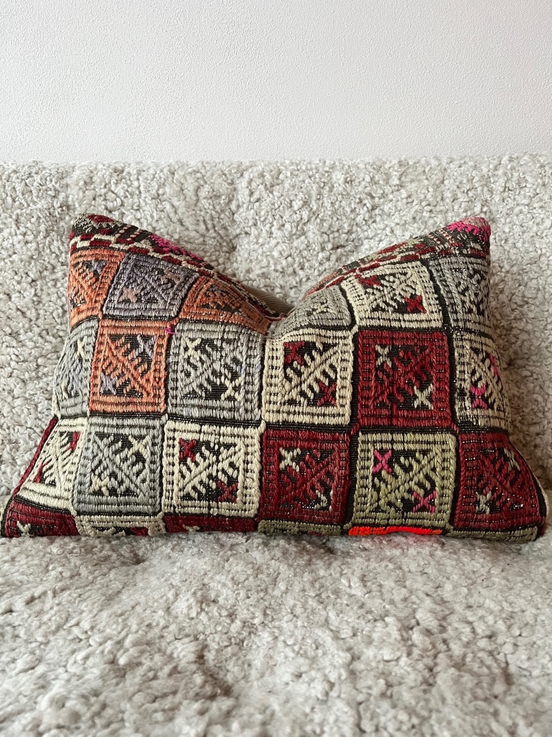 Nydelig putetrekk i rolige og fine farger. Disse vakre kelimmoutene er i høy kvalitet og er pent sydd. Kan kjøpes med eller uten innmat - opp til deg! Hvert putetrekk er helt unikt, finnes kun i et eksemplar.