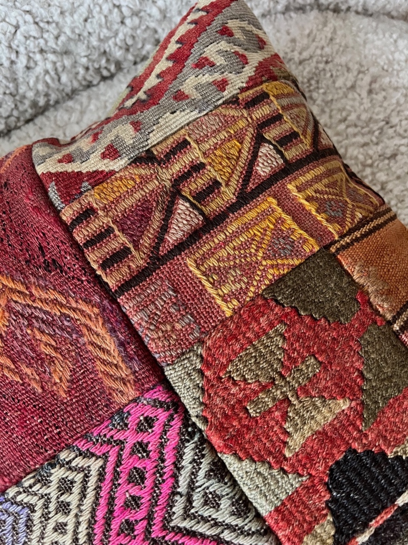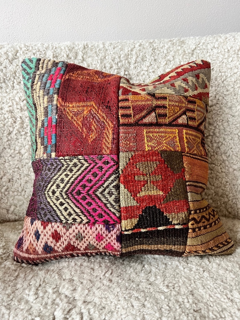 Nydelig putetrekk i friske og klare farger. Disse vakre kelimmoutene er i høy kvalitet og er pent sydd. Kan kjøpes med eller uten innmat - opp til deg! Hvert putetrekk er helt unikt, finnes kun i et eksemplar.