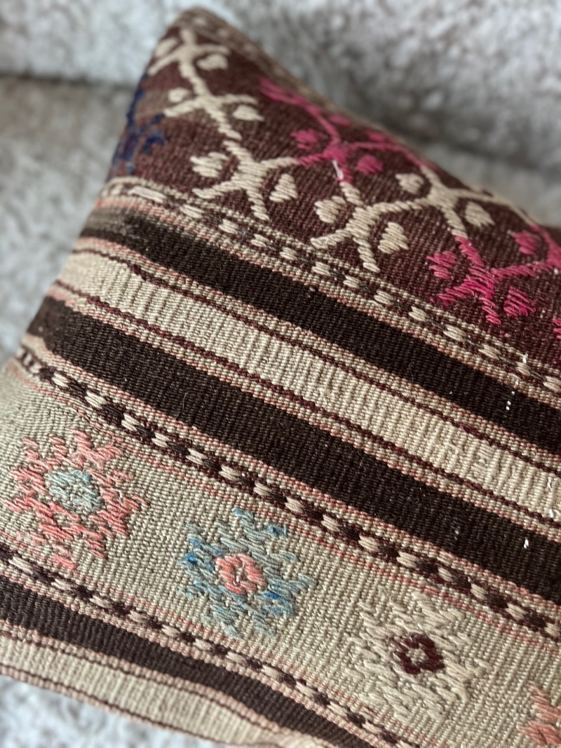Nydelig putetrekk i rolige og fine farger. Disse vakre kelimmoutene er i høy kvalitet og er pent sydd. Kan kjøpes med eller uten innmat - opp til deg! Hvert putetrekk er helt unikt, finnes kun i et eksemplar.