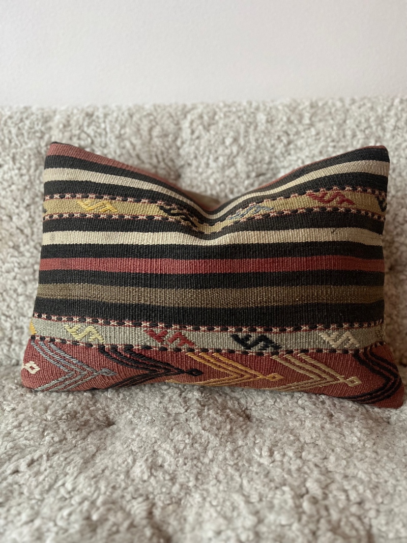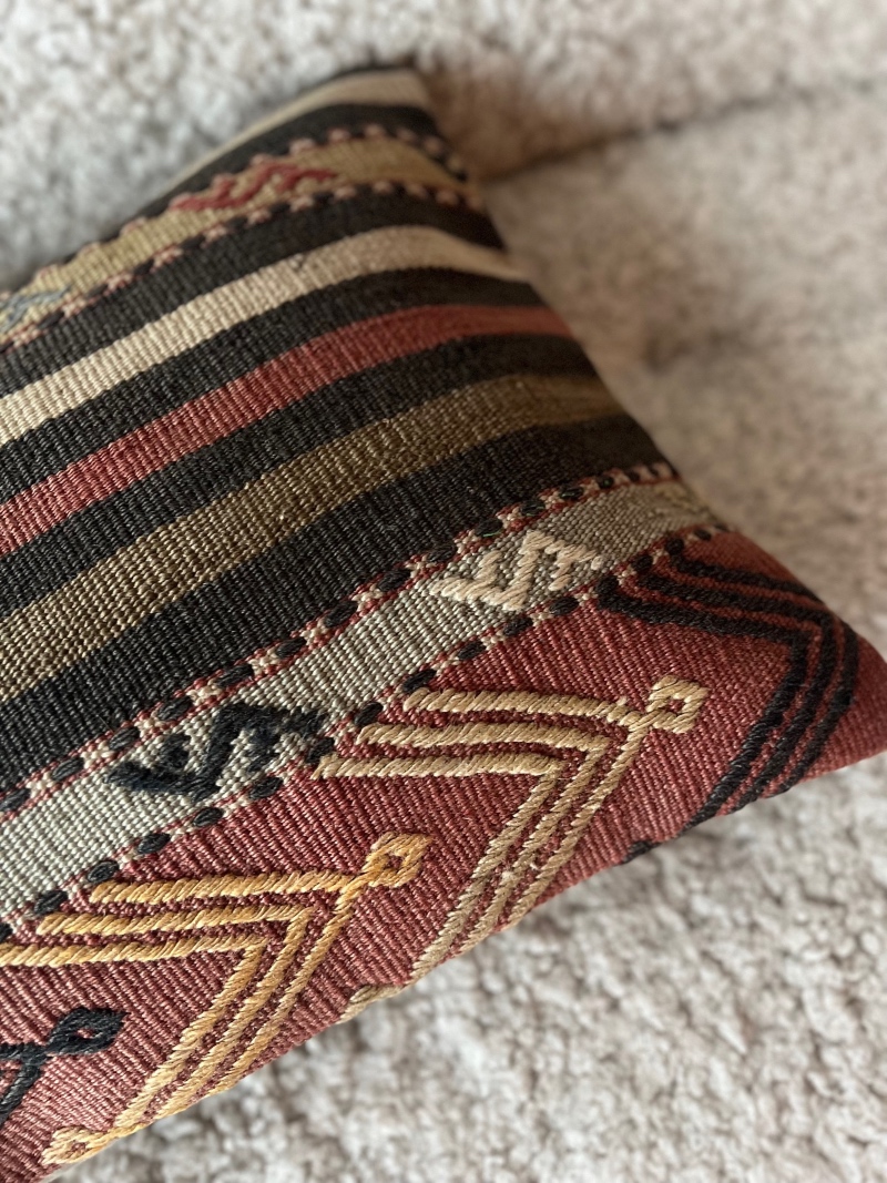 Nydelig putetrekk i rolige og fine farger. Disse vakre kelimmoutene er i høy kvalitet og er pent sydd. Kan kjøpes med eller uten innmat - opp til deg! Hvert putetrekk er helt unikt, finnes kun i et eksemplar.