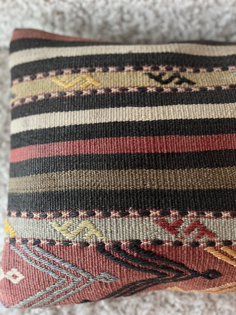 Pute i håndvevd kelim i 100% ull. Putetrekk bakside 100% bomull.