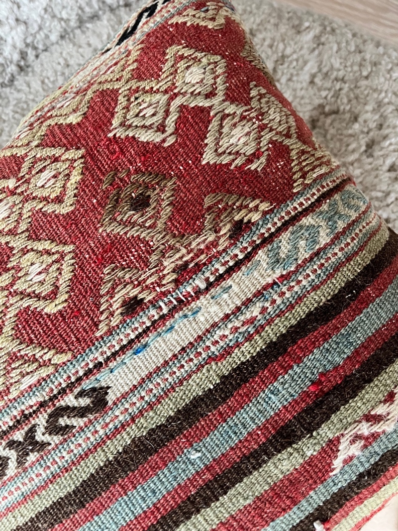 Pute i håndvevd kelim i 100% ull. Putetrekk bakside 100% bomull.