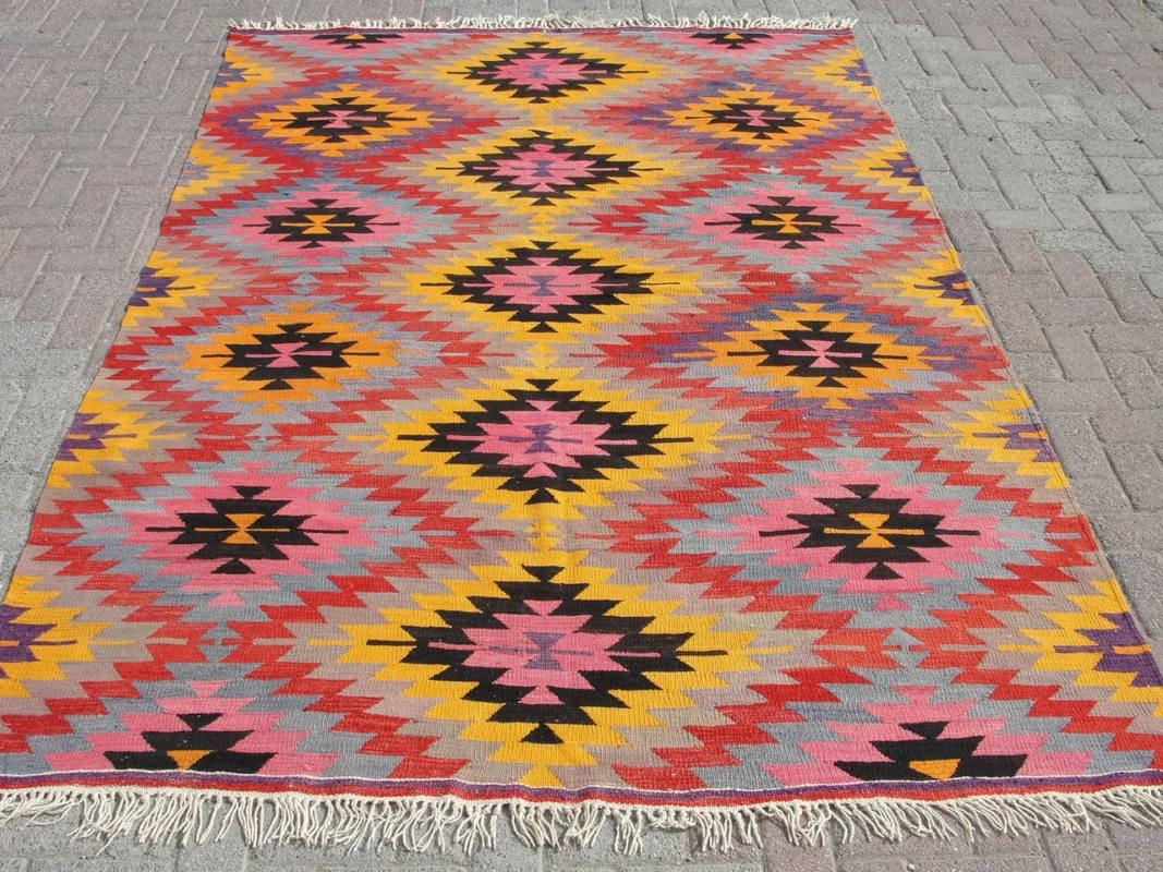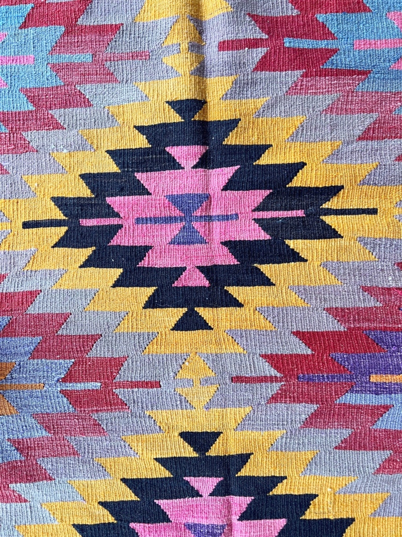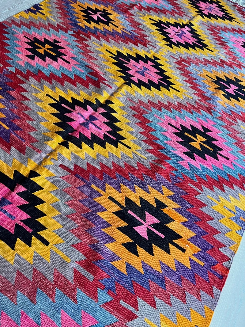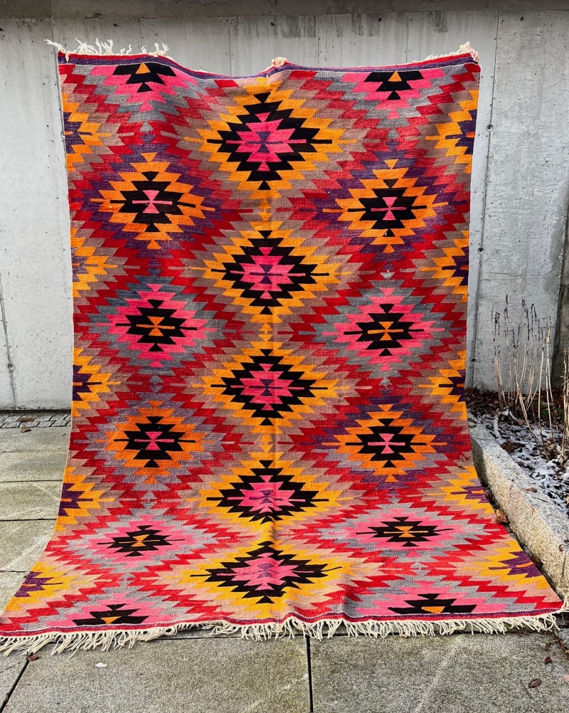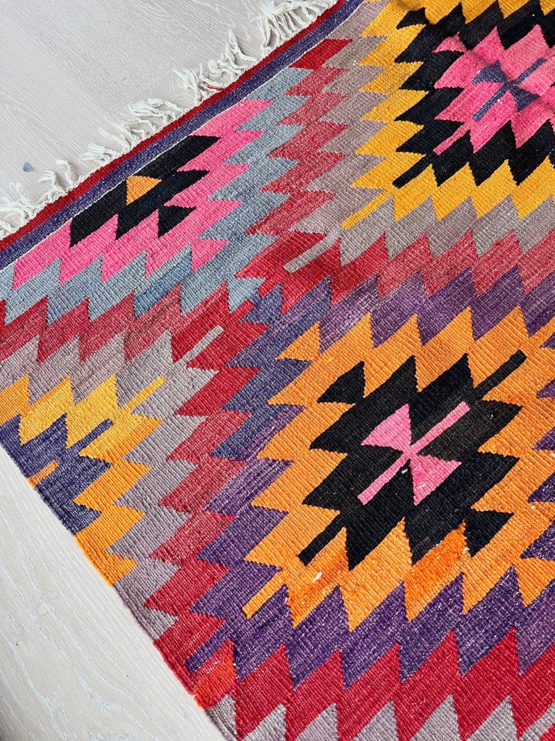 Et fargesterkt og kult kelimteppe fra Denizli i Tyrkia. Dette vintageteppet er håndvevd i håndspunnet ull. 40 år gammelt. Teppet er rosa, rødt og gult, med innslag av beige, blått, oransje og lilla. Så masse energi! Nydelig håndverk og et teppe som både vil være et blikkfang, men også vil kunne tilpasse seg fint i interiøret forøvrig. Klare, fine farger.