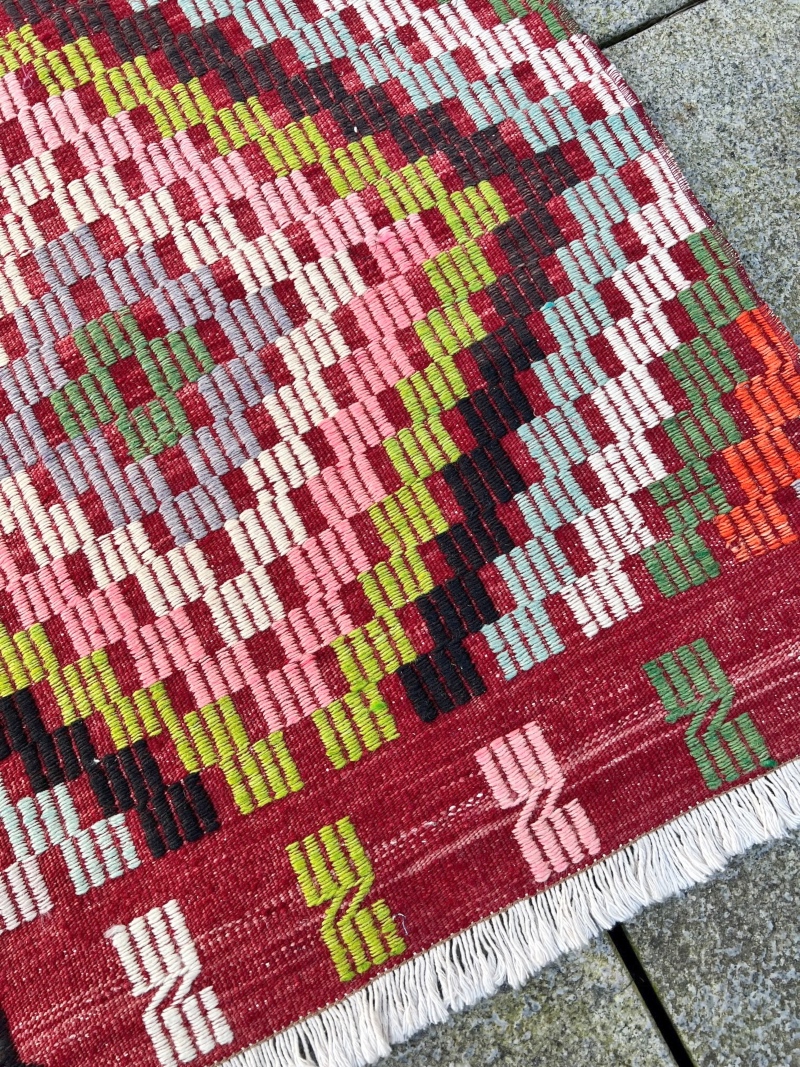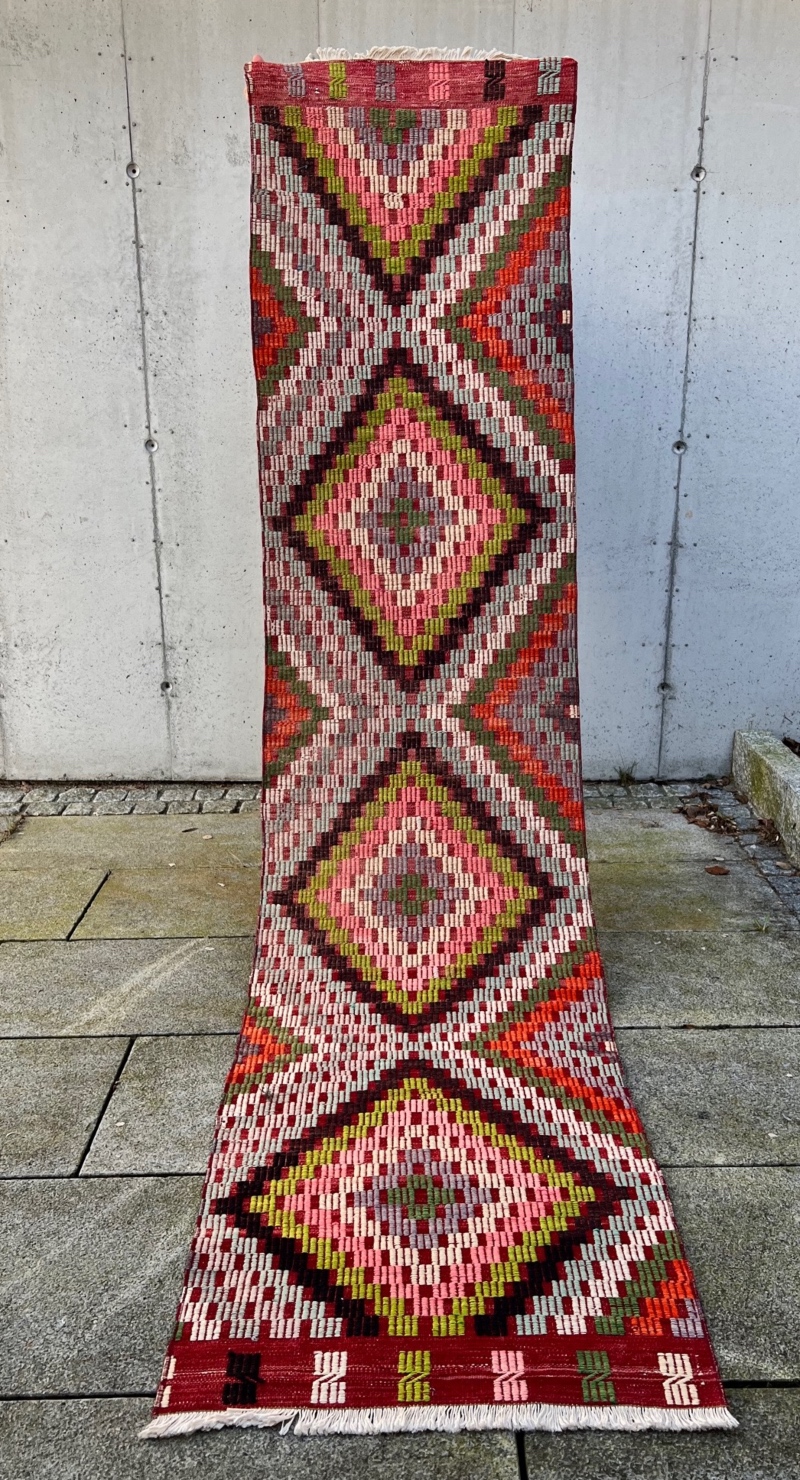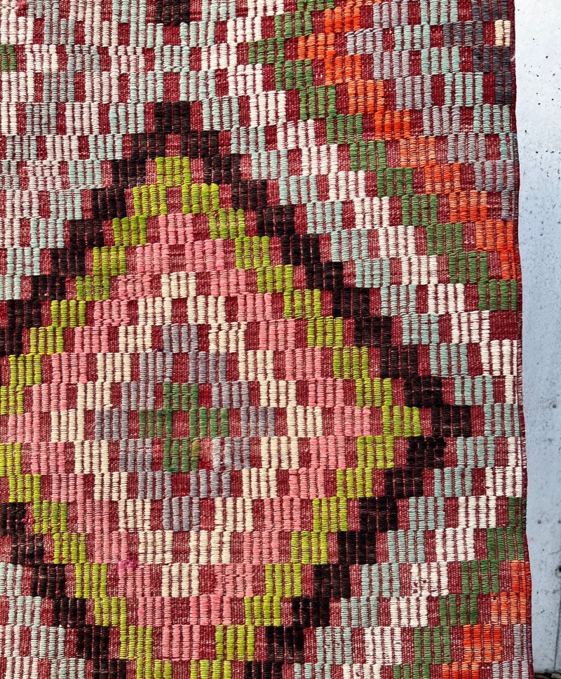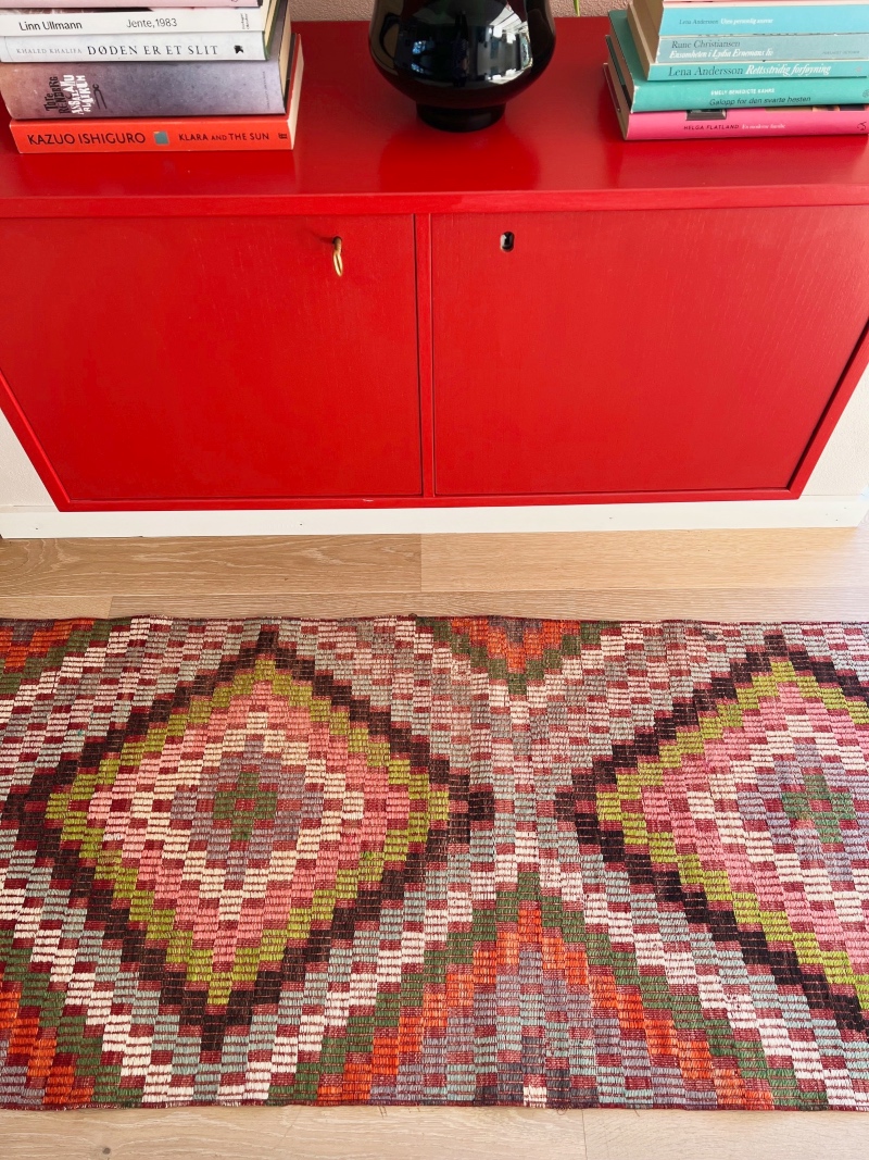 En vintageløper med sterke farger og karakter. Dyp og varm. Fantastisk håndverk. Vintageløperen er fast og fin, flatvevd og vakker. Passer perfekt i ei gang eller et kjøkken. Emre er vevd i Manisa for 40 år siden!