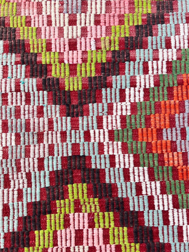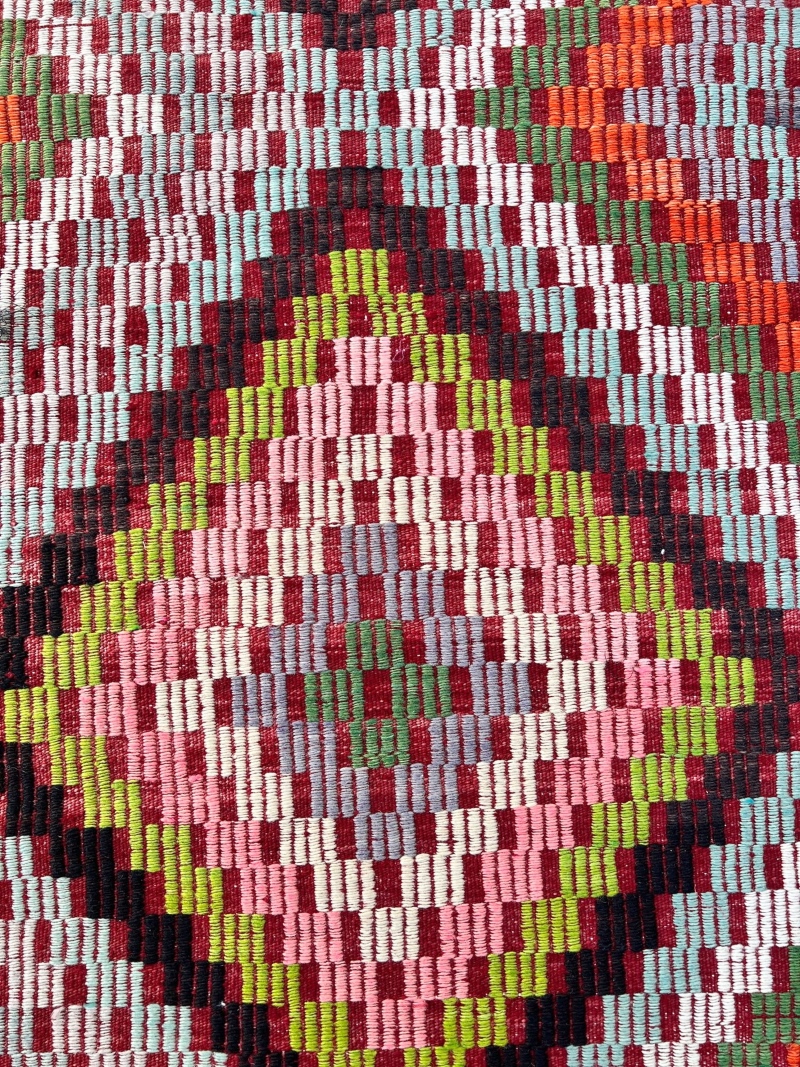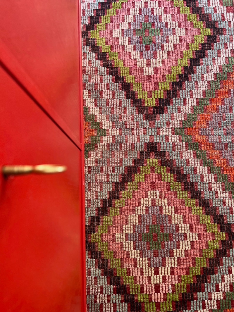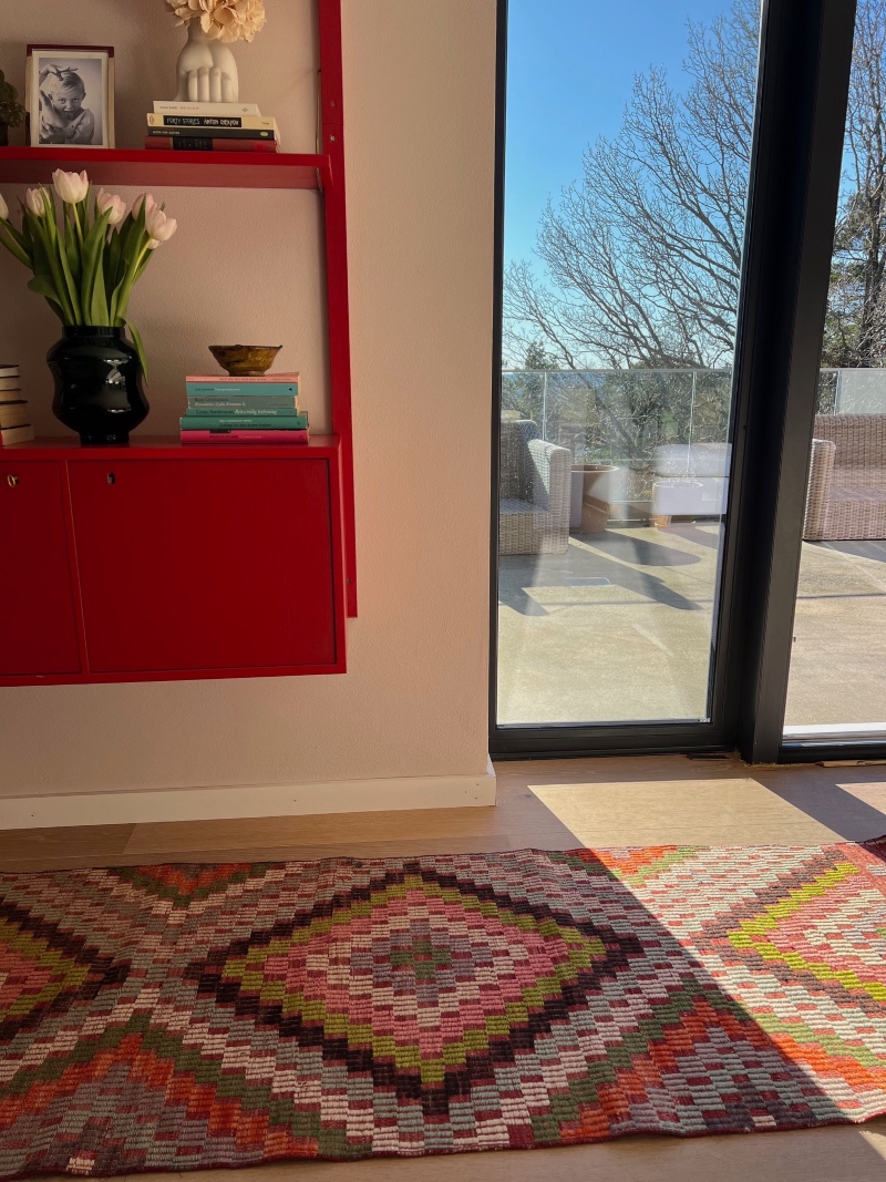 En vintageløper med sterke farger og karakter. Dyp og varm. Fantastisk håndverk. Vintageløperen er fast og fin, flatvevd og vakker. Passer perfekt i ei gang eller et kjøkken. Emre er vevd i Manisa for 40 år siden!