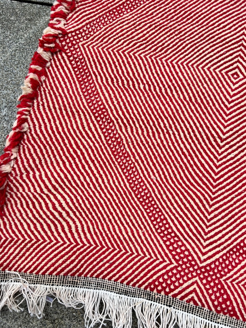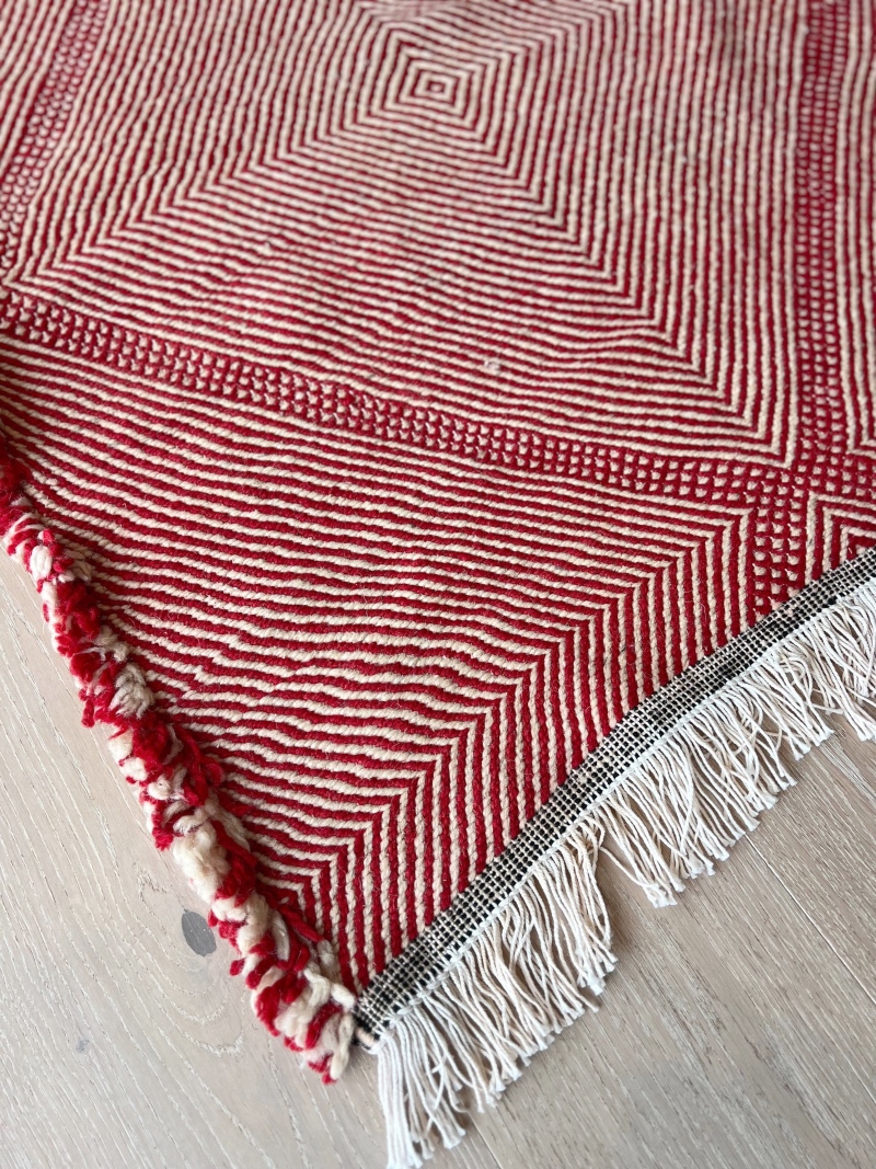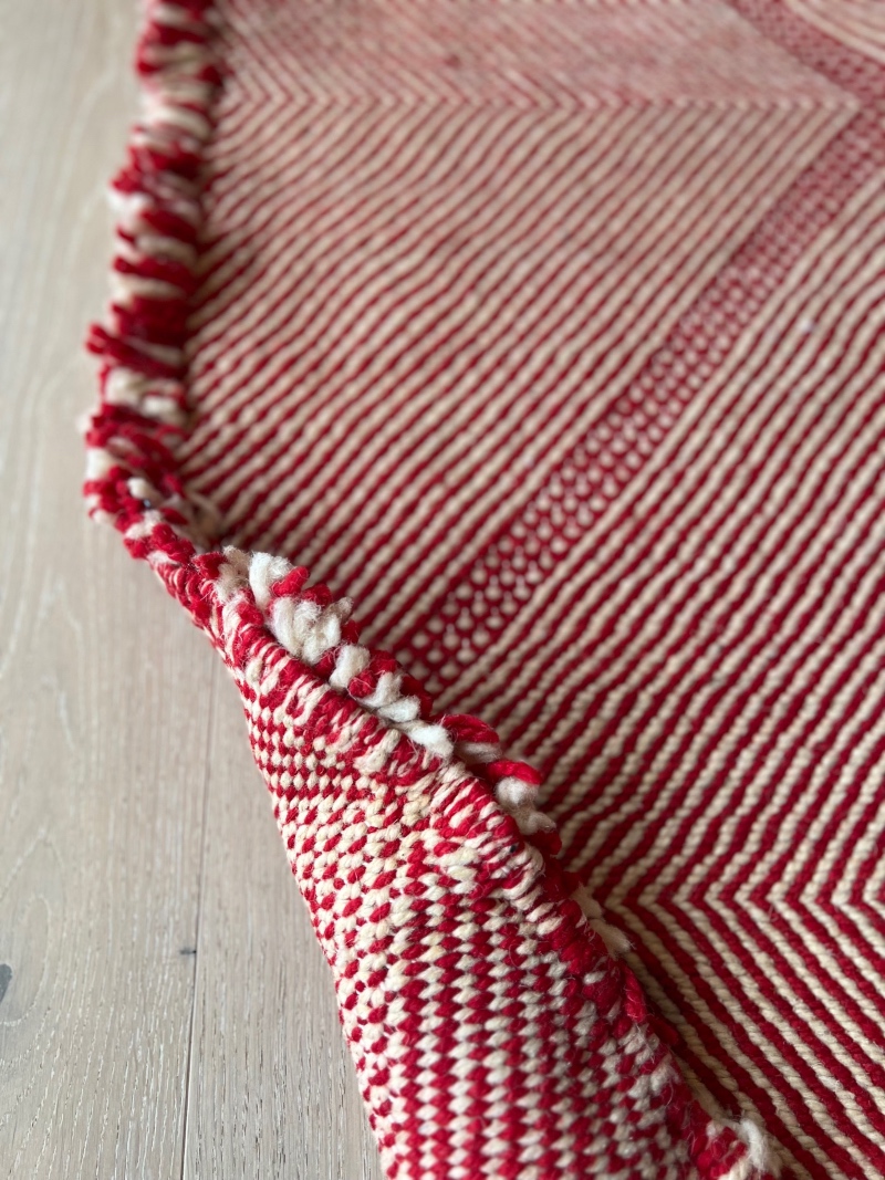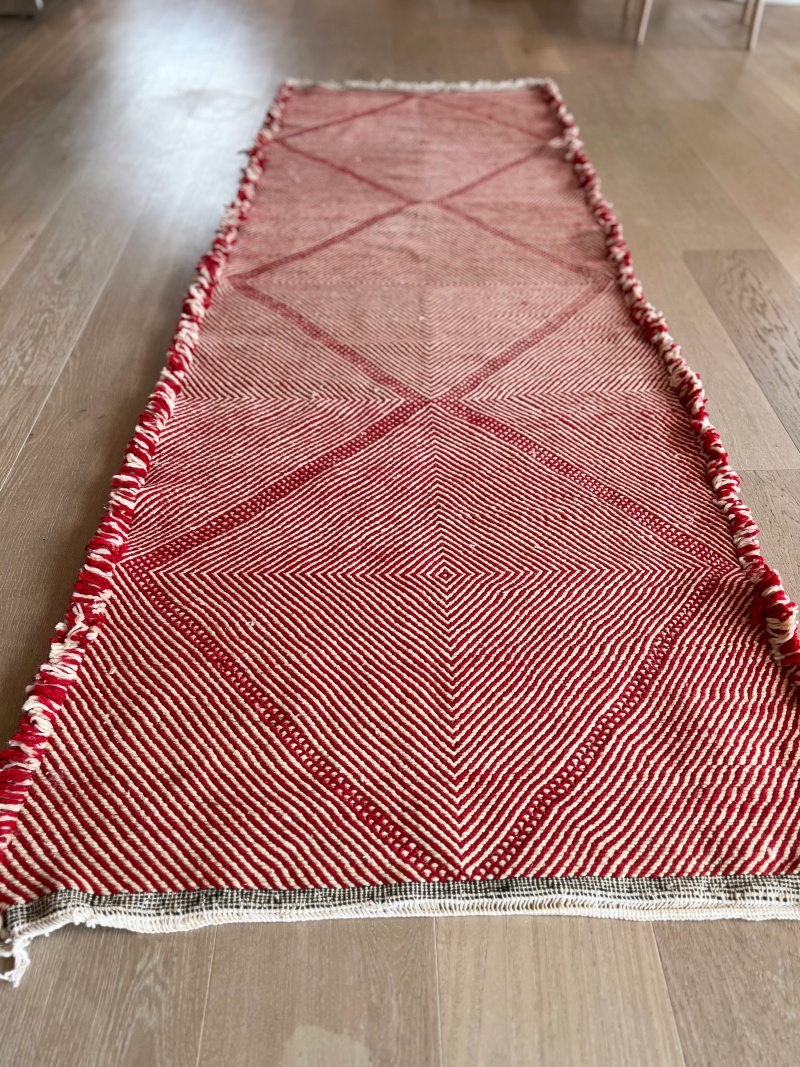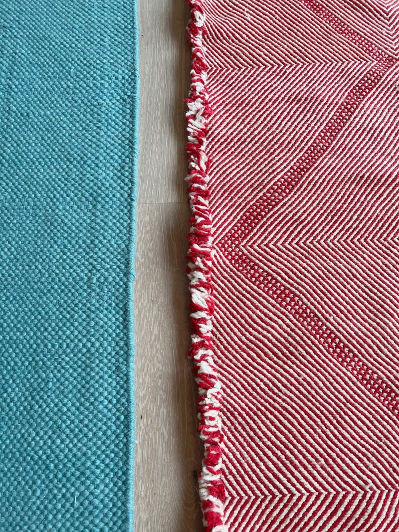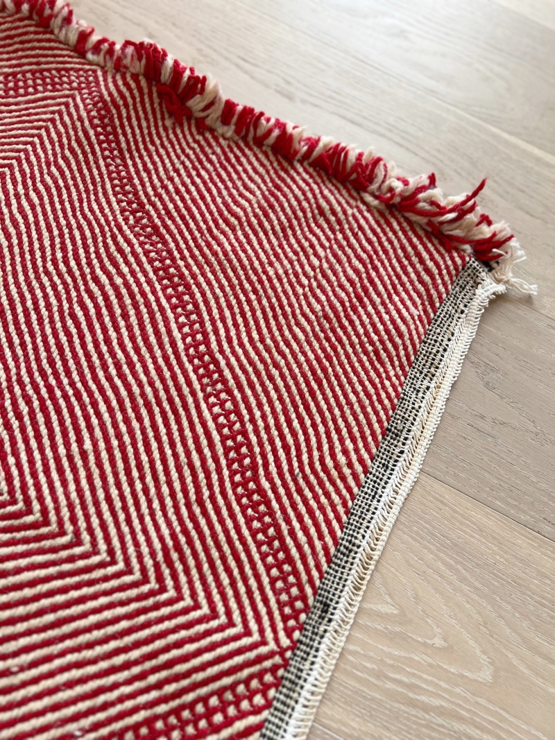 Kelimen er vevd for hånd og skjønnhetsfeil kan forekomme. Vi mener dette øker verdien på håndverk, er det som er sjarmen. Teppet kan ristes og støvsuges.