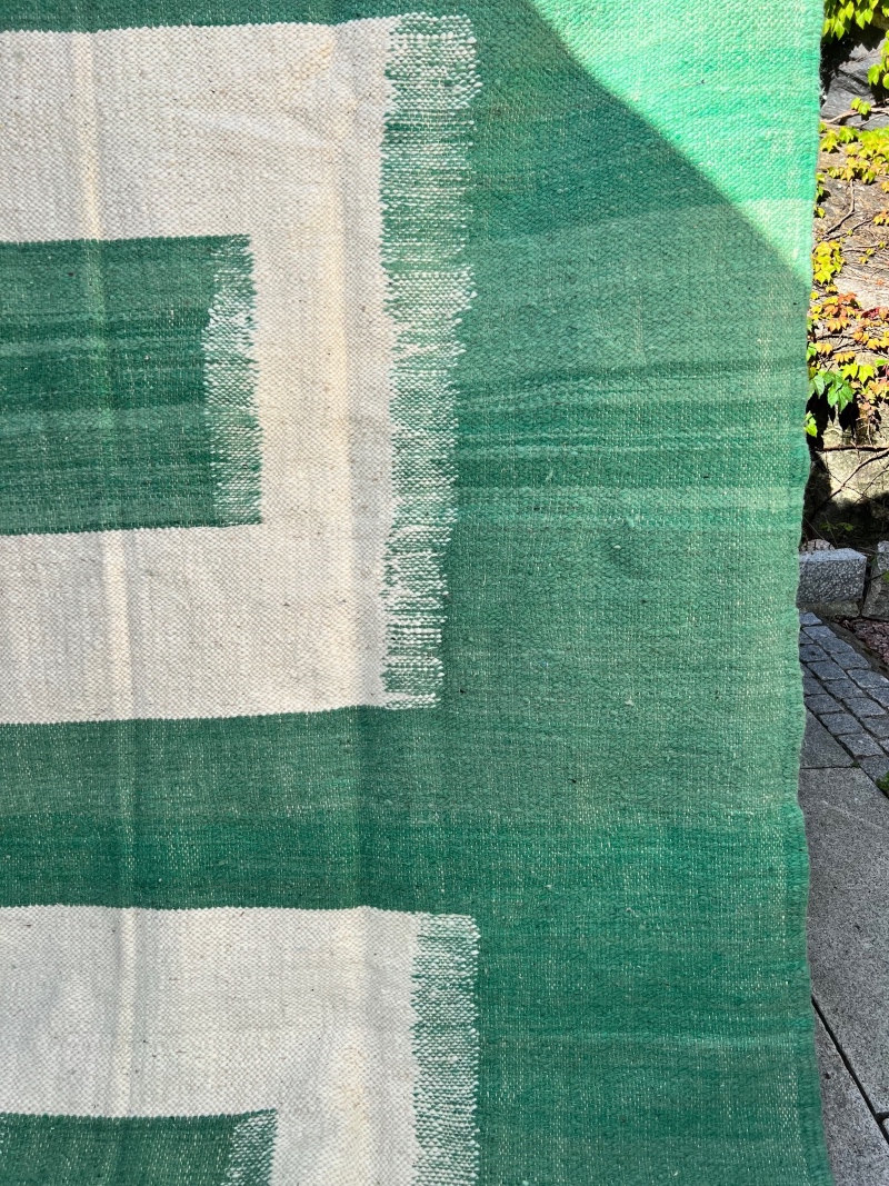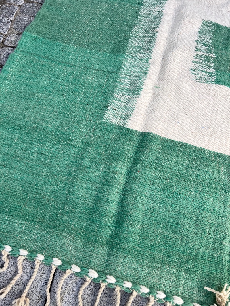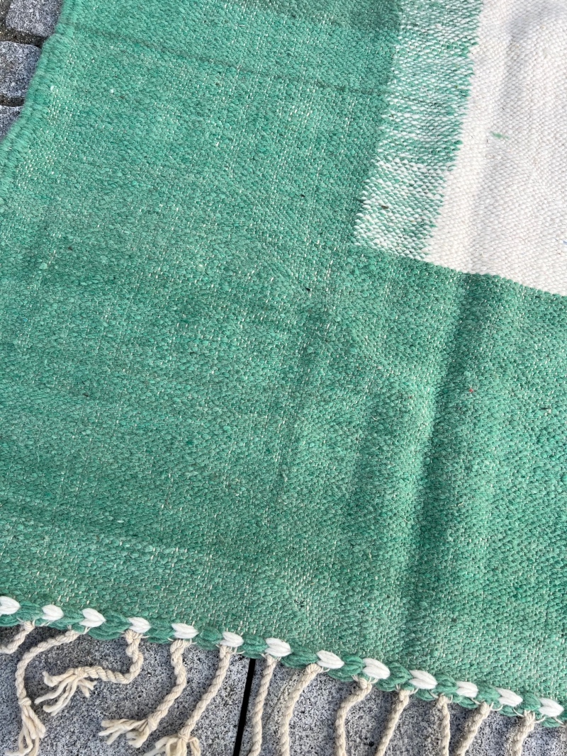 Vakkert kelimteppe rett fra veven. Dette gulvteppet er laget i Taznakht-regionen, der de er viden kjent for sitt gode håndverk. Tykk og fin. Flatvevd som kelimer er. Vakker, balansert sjøgrønn farge.