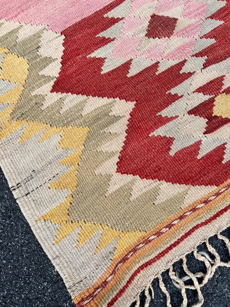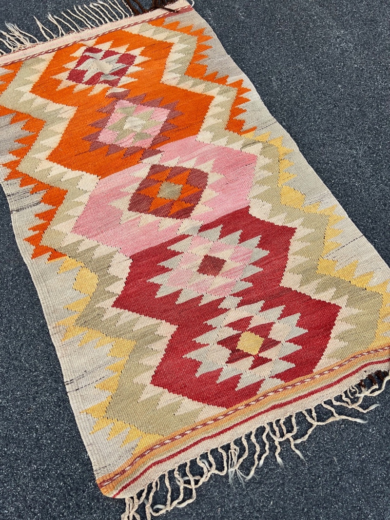 Et vakkert kelimteppe er nå up for grams! Skikkelig one-of-a-kind! Elsker fargene. Teppet er i god stand. Lett og enkelt å holde rent. Hva med å henge på veggen?