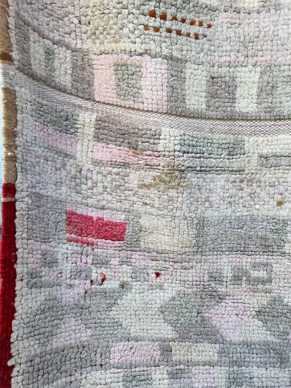 Et lyst og rolig teppe med spennende detaljer. I god stand. Rolig inntrykk som egner seg til å samle sammen et helt rom. Fin størrelse, kan passe i de fleste interiører. Mye finere i levende live!