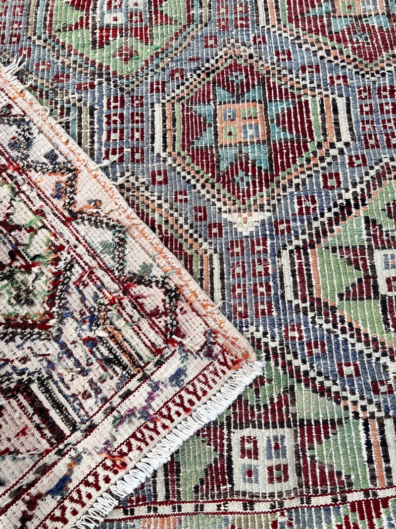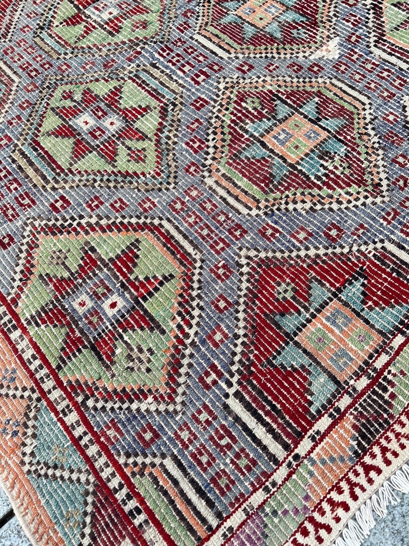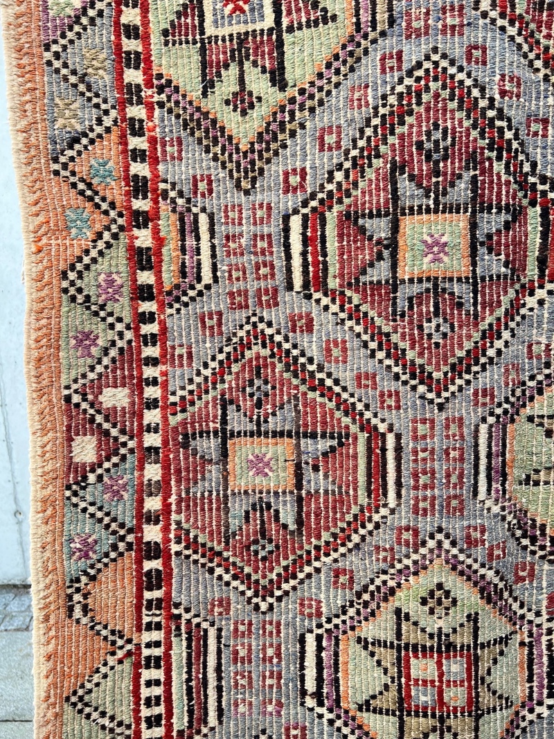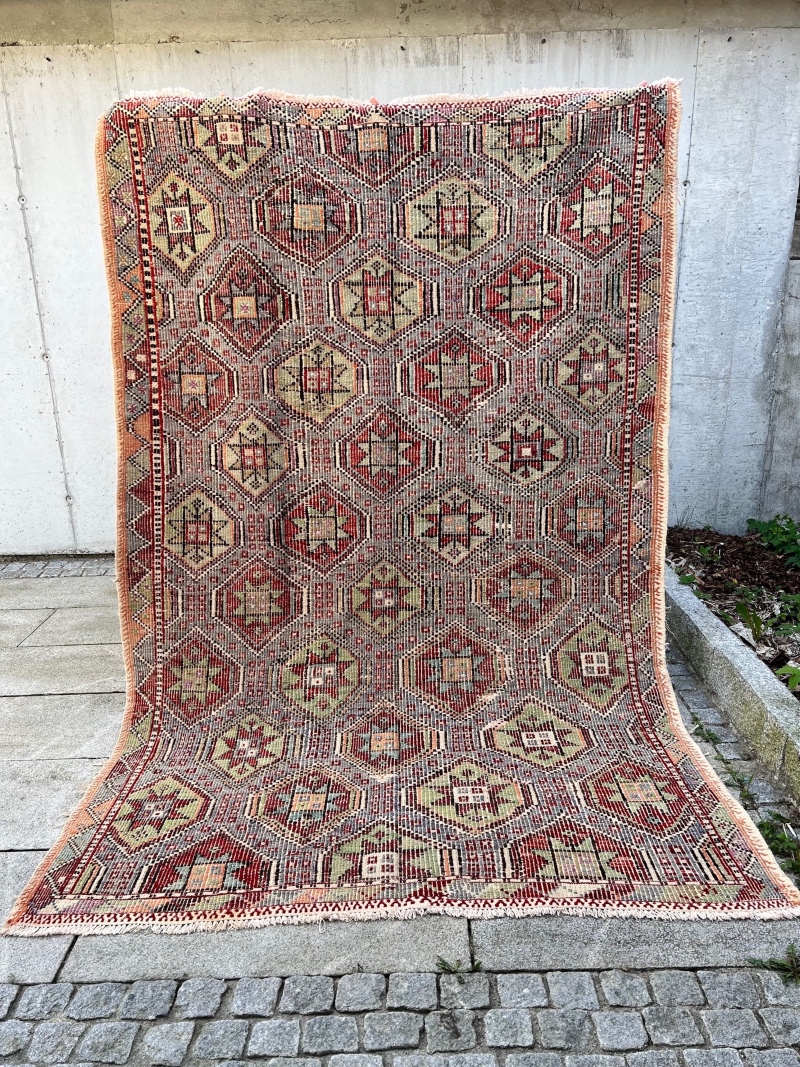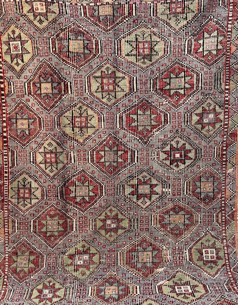 Et rolig kelimteppe fra Usak i Tyrkia. Det er håndvevd i håndspunnet ull. 45 år gammelt. Fantastiske fargekombinasjoner og god dybde! Mål 267 x 177 cm og perfekt under ei sittegruppe.