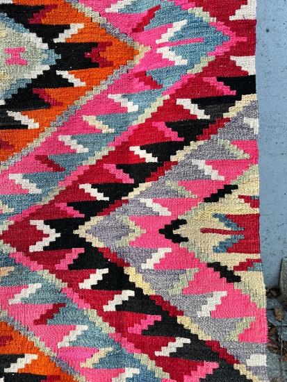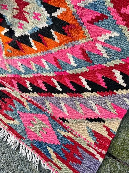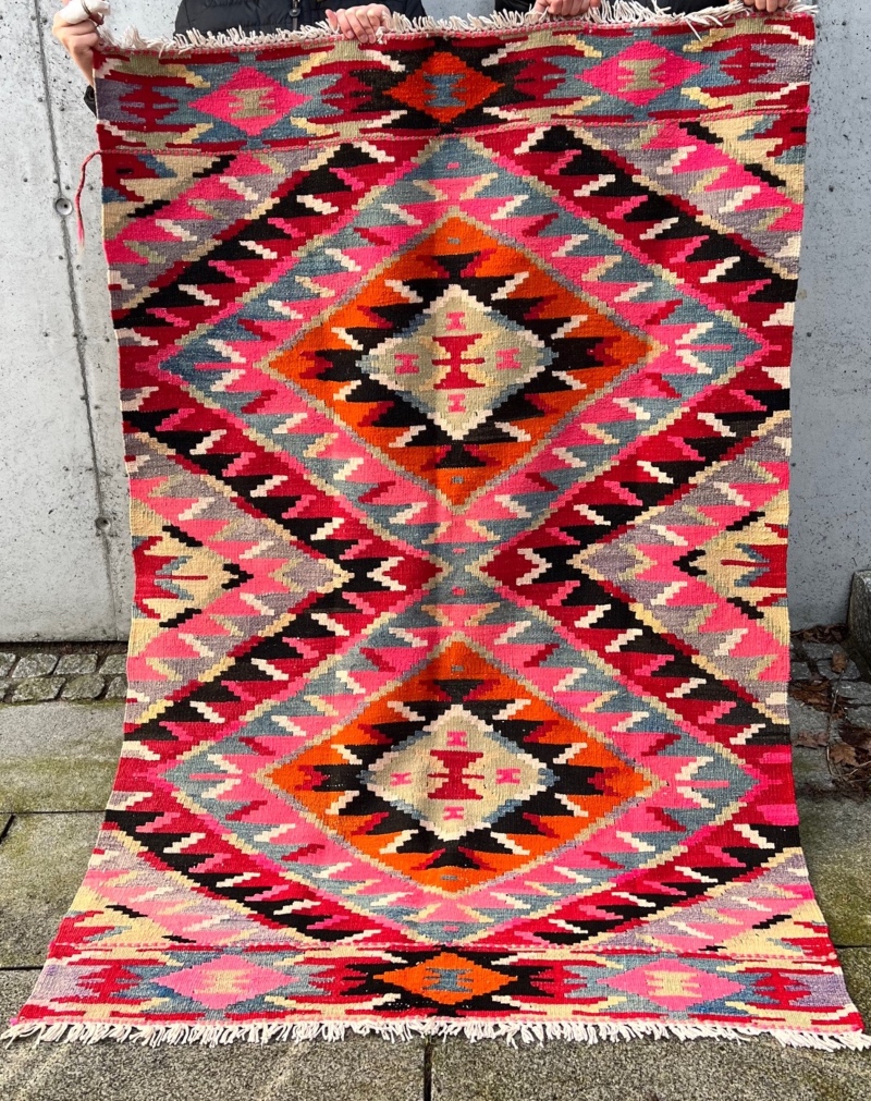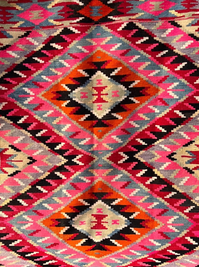 Elvan - Et nydelig og fargesterkt kelimteppe fra Eskisehir i Tyrkia. Det er håndvevd i håndspunnet ull og er 45 år gammelt. Helt unikt og usannsynlig vakkert!