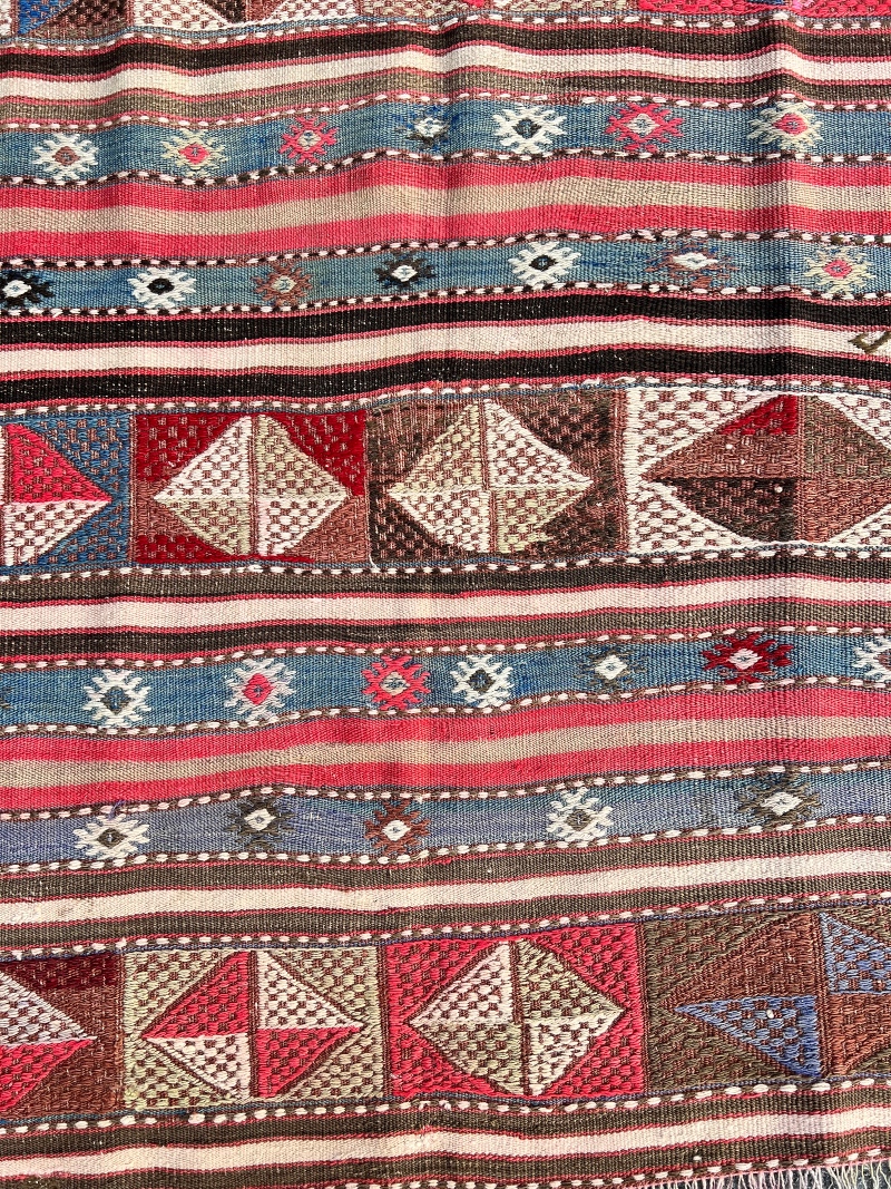 En usannsynlig vakker kelim. Blått, rødt, rosa, brun, oransje og naturhvit. Så intrikat. Vil gi masse energi og farge til interiøret. Fin størrelse som kan plasseres i mange ulike rom!
