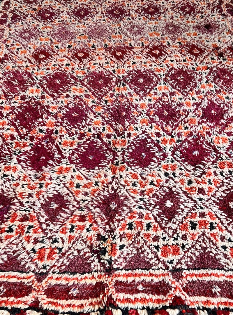 Et nydelig vintageteppe i klare farger. Dette teppet kan løfte et helt rom. Teppet er tykt og tungt. Har et bittelite parti med stivere ull - mest sannsynlig har det blitt forsøkt brent - et triks de bruker i Marokko for å kontrollere at teppet er lagt av ull og ikke inneholder syntetiske materialer. Ingen synlige merker, kun stivere. På størrelse med en hodekål. Prisen reflekterer teppets tilstand. Et skikkelig bra kjøp!